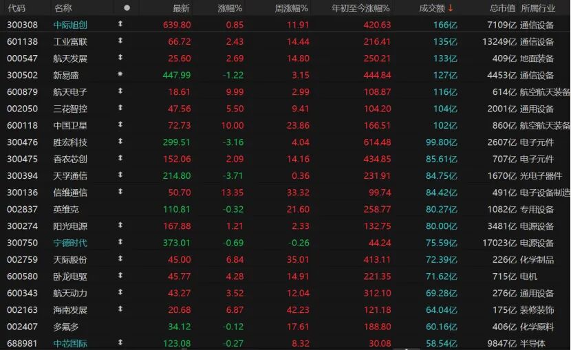格上基金研究员焦冰分析,今日资金向政策确定性与产业景气度集中的板块流入。军工、高端制造板块受益于国产替代与基建补短板政策;汽车、机械设备契合中央经济工作会议“扩内需、稳制造业”导向;非银金融则依托两融余额增至2.5万亿元的资金活跃度提升。而周期类的有色金属受全球需求预期放缓压制,商贸零售则面临前期题材炒作后的分化调整。 个股涨多跌少,3773只个股收涨,涨停股93只;1473只个股收跌,跌停股2只。科技股资金交易量靠前,7只个股日成交额超过100亿元,中际旭创收涨0.85%报639.8元/股,工业富联收涨2.43%报66.72元/股,航天发展收涨2.69%报25.6元/股,新易盛收跌1.22%报447.99元/股。航天电子、中国卫星涨停。