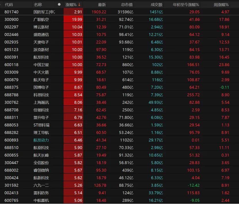 国防军工板块领涨,掀起涨停潮。博云新材、盛路通信、天奥电子、派克新材等10只相关个股涨停,广联航空“20cm”涨停。