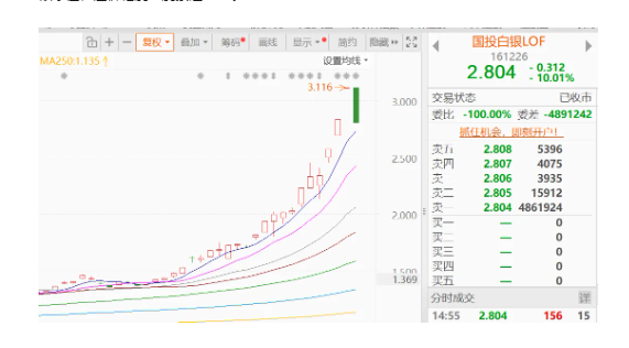 该基金同时公告,截至2025年12月25日,该基金二级市场的收盘价为2.804元,明显高于基金份额净值,投资者如果盲目投资于高溢价率的基金份额,可能面临较大损失。为保护投资者利益,本基金将于2025年12月26日开市起至当日10:30停牌,自2025年12月26日10:30复牌。 近期,国投白银LOF二级市场价格大幅上涨,连续多日涨停,场内交易价格大幅偏离基金份额净值,溢价幅度一度接近70%。