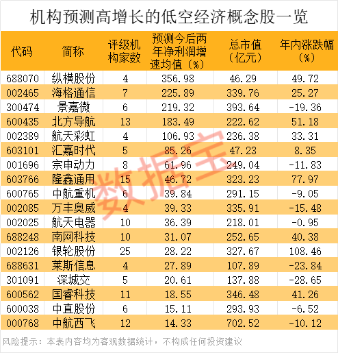 广东发布低空金融“十二条”。 12月25日,在2025粤港澳大湾区低空经济高质量发展大会上,由广东金融监管局牵头联合人民银行广东省分行、广东证监局、深圳金融监管局、人民银行深圳市分行、深圳证监局、广东省发改委等七部门发布《关于金融支持广东低空经济集群发展的通知》(以下简称“低空金融‘十二条’”)。 低空金融“十二条”以“新、全、合”为核心,围绕机制建设、产品服务供给、协同联动、配套保障四大板块,提出12条金融支持举措,破解低空企业“轻资产、高成长、长周期”融资难题,全面赋能低空经济集群发展,为广东低空经济产业蓄势腾飞注入强劲金融动能。 关于资本市场方面,低空金融“十二条”支持符合条件的企业到境内外资本市场相关板块挂牌上市,鼓励用好资本市场并购和并购贷款试点政策,整合产业链资源。支持私募股权创投机构发挥市场化创新发现功能,加强对低空经济领域“硬科技”项目的早期孵化与持续培育。 低空金融“十二条”还支持金融机构积极参与做大广东低空产业基金规模,鼓励在自主风控的基础上对产业基金投资项目形成支持合力,对政府给予奖补的优质低空企业适当给予资源倾斜。 值得注意的是,近日,深圳又一家知名民用无人机公司即将上市。 12月25日,证监会网站显示,深圳市道通智能航空技术股份有限公司(以下简称“道通智能”)启动IPO上市辅导,辅导机构为国泰海通证券。 资料显示,道通智能成立于2014年,是全球领先的无人机数字化行业解决方案供应商,以生产高品质的无人机产品而闻名,产品覆盖消费级和专业级市场。品牌网显示,道通智能是中国十大民用无人机品牌。 低空经济持续获政策支持 低空经济作为国家战略性新兴产业,持续受到政策支持。 2021年,国务院印发《国家综合立体交通网规划纲要》,首次提出发展“低空经济”。2023年,中央经济工作会议将其列为战略性新兴产业重点培育对象。2024年,低空经济首次写入政府工作报告。 今年发布的“十五五”规划建议提出,打造新兴支柱产业,加快低空经济等战略性新兴产业集群发展,标志着低空经济从区域性探索正式上升为国家战略层面的系统布局。 地方层面,全国已有超30个省市将低空经济写入《政府工作报告》并发布行动计划。 广东、北京、四川等地已形成完善的航空产业链,长三角和粤港澳大湾区成为全球eVTOL企业最密集的区域。 广东作为低空经济大省,涌现出大疆、亿航智能、中信海直等一大批行业龙头企业,构建起覆盖原材料、零部件、动力系统、机载设备、导航定位、运营服务等完整产业链条。 目前,广东低空经济已达到千亿级规模,低空飞行器制造企业超2000家,相关企业超1.5万家,占全国低空经济产业链企业的30%以上,位居全国第一。消费级无人机、工业级无人机分别占全球市场份额的70%和50%。 业绩有望高增长概念股出炉 作为万亿级产业,低空经济市场潜力巨大。据中国民航局预测,2025年中国低空经济市场规模将达1.5万亿元,未来低空经济将保持年均25%以上的复合增长率,2035年有望突破3.5万亿元。 据证券时报·数据宝统计,A股中,低空经济相关概念股有70余只,其中广东相关的上市公司有南网科技、中信海直、海格通信、航新科技、航宇微、深城交等。 今年四季度以来,有15只低空经济概念股获得2次及以上投资者调研,广联航空获调研次数最多,达到5次,纵横股份、中航西飞、亿嘉和、莱斯信息则获得3次及以上调研。 广联航空在最近一次调研中表示,在民用无人机业务方面,公司锚定低空经济产业机遇,将军用无人机领域的高精度制造、高可靠性设计等技术优势,复用于商用货运、工业巡检、应急救援等场景,目前处于市场拓展与技术适配的关键阶段。 纵横股份在最近一次调研中表示,公司将继续紧抓低空经济产业增长机遇,大力推进无人机系统“软硬件+方案”闭环应用,积极开拓国内、国际市场,大力推进低空数字经济市场开发。