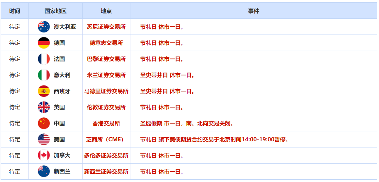 宏观面 国内方面: 商务部新闻发言人何咏前25日在回答关于美宣布对部分中国半导体产品加征301关税的有关提问时说,中方注意到有关情况,已通过中美经贸磋商机制向美方提出严正交涉。中方不认同美方301调查的所谓结论,坚决反对美对华半导体产品加征301关税。 【国家发改委:有序发展低空经济、枢纽经济、通道经济,培育邮轮游艇、汽车营地等体验经济】国家发展改革委基础设施发展司发布文章《加快构建现代化基础设施体系》。文章指出,扎实推进“十五五”现代化基础设施体系建设。提升综合功能。以服务国家重大战略实施和重点领域安全能力建设为引领,以支撑经济高质量发展为导向,丰富拓展基础设施功能。交通领域,提升基础设施互联互通水平和运输服务质量效率,有力支撑区域协调发展战略、区域重大发展战略、新型城镇化战略、乡村振兴战略实施。强化国家战略腹地交通运输保障,拓展多元化国际通道航线,推动重大基础设施全面贯彻国防要求。有序发展低空经济、枢纽经济、通道经济,培育邮轮游艇、汽车营地等体验经济。能源领域,统筹国内国际两个市场,优化能源资源进口,鼓励企业有序走出去参与能源项目建设。夯实煤炭保供压舱石基础,加快煤炭优质产能释放。稳步提升煤炭、石油、天然气实物储备。有序推进国家煤制油气战略储备基地建设。 美元方面: 隔夜美元指数下跌0.05%报97.91。美国劳工部周三公布的数据显示,美国截至12月20日当周初请失业金人数为21.4万人,预期为22.4万人,前值为22.4万人。截至12月13日当周续请失业金人数为192.3万人,预期为190万人。 近期数据因假日季前季节性调整面临挑战而出现波动,美国上周初请失业金人数意外下降,但劳动力市场仍处于经济学家和政策制定者所称的"不招聘、不解雇"模式,12月失业率可能仍维持在高位。 其他货币方面: 日股周四小幅收高,日经指数上涨0.13%至50407.79点,日本央行行长植田和男周四表示,日本的基本通胀正在稳步接近央行2%的目标,并释放了进一步加息的信号。他指出,如果经济按基准情景发展,央行将继续根据经济和物价的改善情况上调利率。此举旨在促使工资和通胀形成良性循环。日本央行上周已将利率上调至0.75%,为30年来高位,市场普遍预计下一次政策会议(1月22-23日)将维持利率稳定,但将关注其对日元疲软及其通胀影响的看法。(汇通财经) 数据方面: 今日,将公布日本12月东京CPI年率、日本11月失业率,澳大利亚截至12月21日当周ANZ消费者信心指数等数据。 此外,当下正值海外圣诞假期,部分交易所因节礼日与圣诞节连休,具体安排如下: