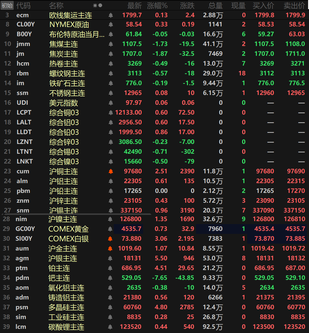 SMM12月26日讯: 金属市场方面: 隔夜内盘基本金属普涨,仅沪铅持平于17265元/吨,沪铜以高达2.51%的涨幅领涨,盘中最高冲至97960元/吨,续刷其上市以来的历史新高;沪镍涨1.35%,其余金属涨幅均在1%以内。 黑色系方面普跌,不锈钢唯一飘红,涨0.08%。螺纹跌0.57%,热卷跌0.49%。双焦一同跌超1%,焦煤跌1.73%,焦炭跌1.87%。 外盘基本金属方面,LME金属因圣诞节假期休市。 贵金属方面,隔夜COMEX黄金和COMEX白银因圣诞节假期休市。国内方面,沪金涨1.07%,沪银涨5.5%,沪银盘中最高冲至18166元/千克,继续刷新其历史新高。 截至12月26日8:21分隔夜收盘行情