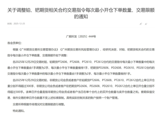 值得关注的是,针对铂、钯期货市场波动有所增大、整体交易热度有所提高的情况,交易所及时出台多项措施,引导市场交易回归理性。 25日晚间,广期所调整铂、钯期货相关合约交易指令每次最小开仓下单数量、交易限额。