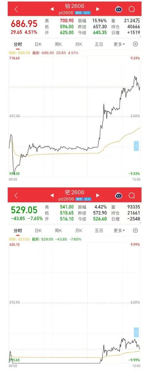 受外盘铂、钯价格大幅冲高回落影响,12月25日,广期所铂、钯期货大幅低开,随后走势显著分化,铂期货盘中再创上市新高,主力2506合约报收于686.95元/克,上涨4.51%;钯期货则维持较弱走势,报收于529.05元/克,下跌7.65%。