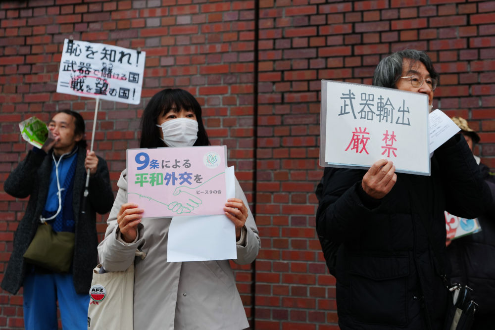 针对日本执政联盟自民党与日本维新会拟取消对武器出口的5种类型限制、为武器出口大幅“松绑”,日本民众25日下午在位于东京的自民党总部前举行抗议集会。