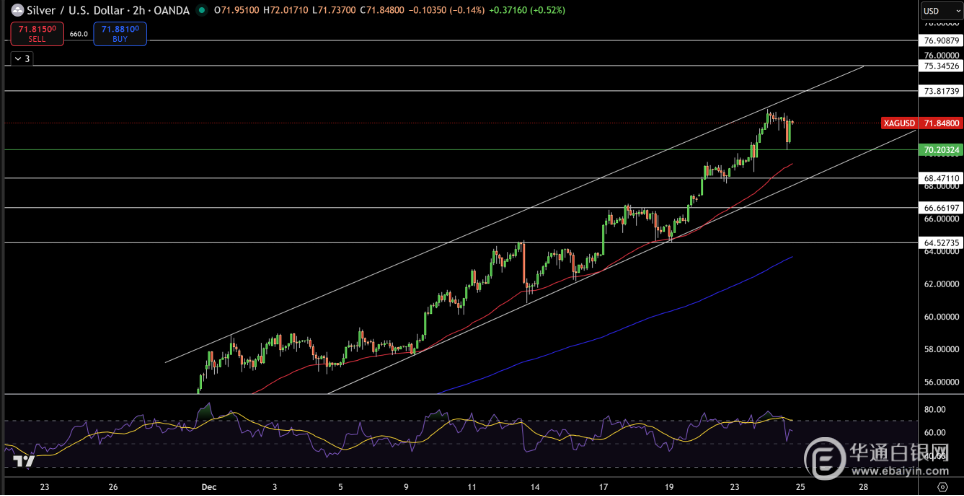 白银2小时图当前持稳于71.85美元附近,该价位反映了12月25日圣诞节假期之前周三的收盘水平,此技术形态对市场重新开盘后的走势具有参考意义。银价仍运行于一个清晰的上升通道内部,自12月初56.00美元附近基位启动的高点与低点同步上移结构仍在提供支撑。 最新回调出现于73.80美元下方遇阻之后,该区域的上影线表明通道阻力位附近存在获利了结。目前K线正于70.20美元支撑区域上方趋于稳定,该区域与通道中线及前期突破结构相吻合。50 EMA持续紧密跟随价格走势,而200 EMA仍远低于当前价位,印证了趋势的强度。 相对强弱指标(RSI)已从接近70的水平回落至60附近,暗示当前为整理行情而非趋势反转,整体偏向保持积极。下一阶段可考虑在70.20美元附近逢低布局,止损设于69.20美元,上行目标看向73.80美元。 截止北京时间09:40,华通现货白银定盘价报18477元。 白银网 |