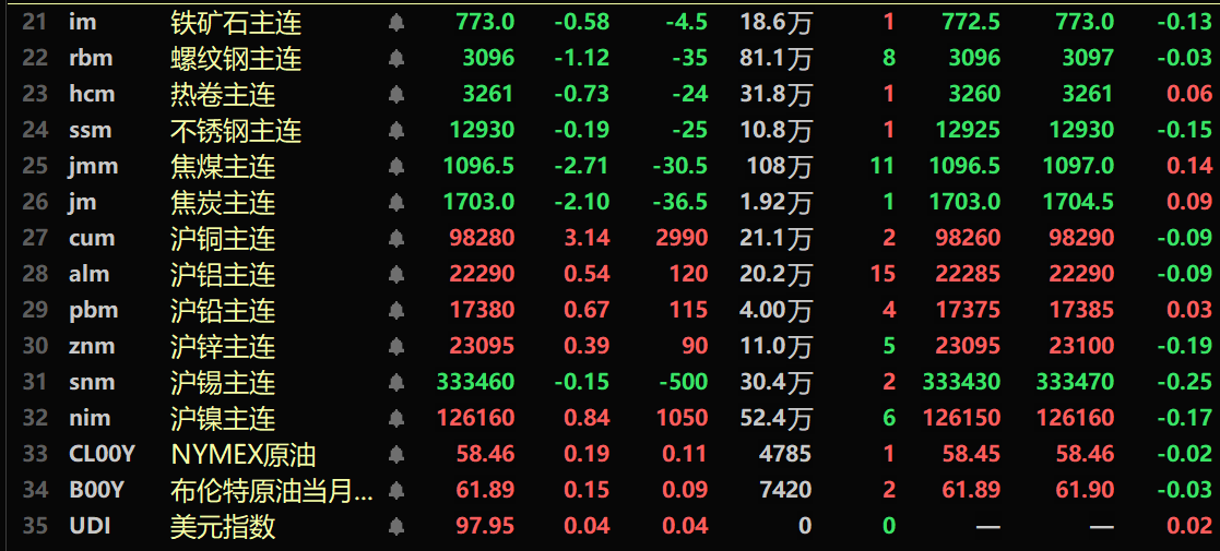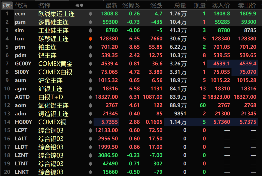 SMM12月26日讯: 金属市场方面: 截至午间收盘,内盘基本金属普涨,沪铜涨3.14%,盘中刷新历史新高至98800元/吨。沪铝涨0.54%。沪铅涨0.67%,沪锌涨0.39%。沪锡跌0.15%,沪镍涨0.84%。 此外,铸造铝主连期货涨0.4%,氧化铝主连涨4.61%。碳酸锂主连涨6.35%。工业硅主连跌0.06%。多晶硅主连跌0.73%。 黑色系均飘绿,铁矿跌0.58%,螺纹跌1.12%,热卷跌0.73%,不锈钢跌0.19%。双焦方面:焦煤主力合约跌2.71%,焦炭主力合约跌2.1%。 外盘基本金属方面,LME金属因圣诞节假期休市。 贵金属方面,截至11:34分,COMEX黄金涨0.81%,盘中刷新历史新高至4561.6美元/盎司;COMEX白银涨4.72%,盘中刷新历史新高至75.495美元/盎司。内盘贵金属方面:沪金主连涨0.65%,盘中刷新历史新高至1023.96元/克;沪银主连涨6.58%,盘中刷新历史新高至18604元/千克。 此外,截至午间收盘,铂主连期货涨8.65%;钯主连期货涨2.42%。 截至午间收盘,欧线集运主力合约跌0.26%,报1808.8点。 截至12月26日11:34分,部分期货午间行情: