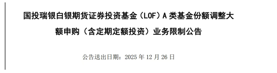 白银基金限购,普通人的“白银赛道”变窄了? 若您想深入了解更多贵金属期货的专业信息,欢迎咨询:》国泰君安期货 近期白银行情异常火爆,短短不到一个月的时间便实现高达38%的涨幅,吸引了众多投资者的目光。 对于大多数普通投资者而言,公募基金是最直观、便捷的参与途径,而国内直接挂钩白银的产品本就稀缺,因此国投瑞银白银期货(LOF)自然成为市场追逐的焦点...... 然而,过热的情绪也催生了非理性交易。该基金在二级市场的交易价格被持续推高,显著偏离其实际净值,溢价率一度逼近60%。这意味着,投资者若当时买入,相当于额外支付近六成的“情绪溢价”,潜在风险巨大。 为抑制过热、警示风险,基金管理人多次采取盘中临时停牌等措施,但市场情绪一时难平。最终,基金公司在12月26日发布公告,将单日申购限额严格设定为100元。这一举措,虽属无奈,却也几乎关上了普通投资者通过公募基金便捷参与白银行情的大门。