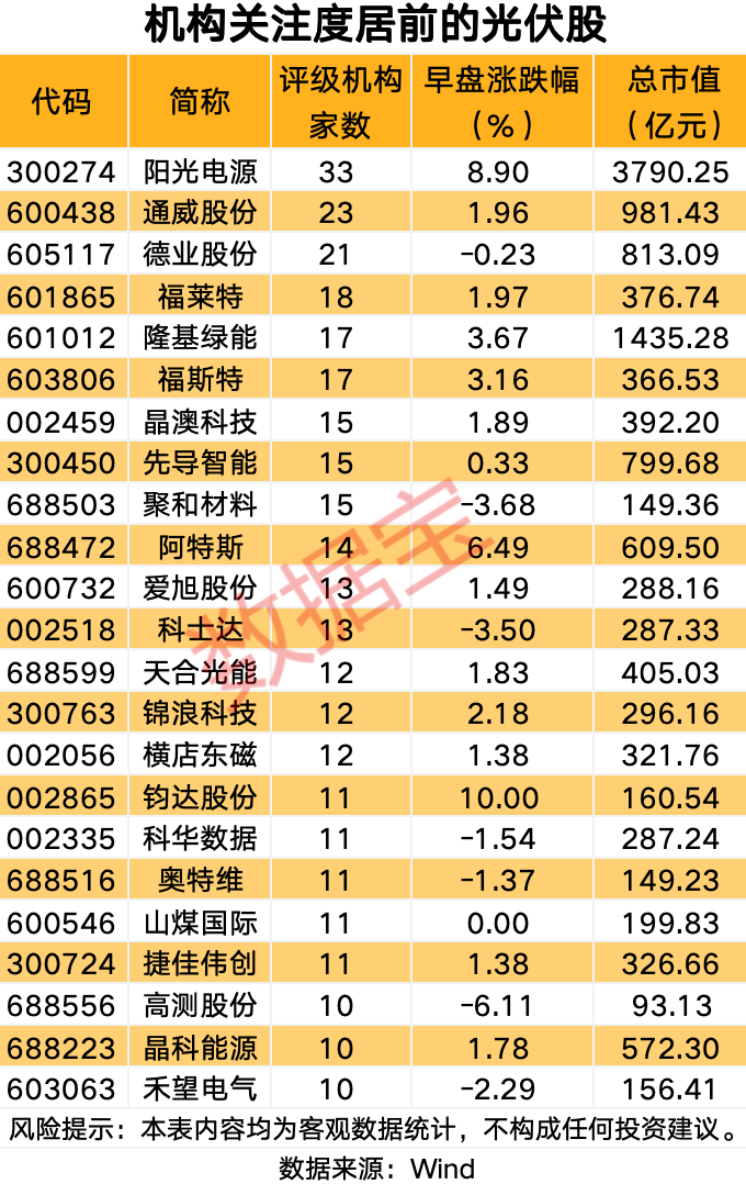 消息面上,12月25日,四家头部硅片企业联合大幅上调报价,其中183N硅片报价1.4元/片、210RN报价1.5元/片、210N报价1.7元/片,平均涨幅达到12%。业内普遍反馈,本次硅片涨价主要是上游硅料涨幅较大所致。 数据显示,多晶硅主力合约下半年以来价格持续走高,7月以来累计上涨超70%,现货方面,据安泰科数据,本周多晶硅n型复投料成交均价为5.39万元/吨,n型颗粒硅成交均价为5.05万元/吨,较7月初分别上涨45.28%、41.85%。硅料价格上涨为下游硅片涨价提供基本面支撑。 今年以来,硅料头部企业包括通威股份、大全能源等带头减产,以达到消化库存、减少亏损的目的。在2025光伏行业年度大会上,中国光伏行业协会名誉理事长王勃华表示,多晶硅自2013年以来产量首次同比下降,硅片自2009年以来首次同比下降。2025年1—10月,多晶硅产量约111.3万吨,同比下降29.6%;硅片产量约567GW,同比下降6.7%。 政策面上,工信部等部门通过修订能耗标准、推动兼并重组等方式,加速落后产能出清,工信部8月发布《2025年度多晶硅行业专项节能监察任务清单的通知》,对41家多晶硅企业开展节能监察。8月工信部等六部门联合召开光伏产业座谈会,推动落后产能有序退出、遏制低价无序竞争。 多家机构认为,看好光伏产业链景气度拐点向上。东吴证券研报认为,随着行业“反内卷”的推进,预计2026年起硅片、组件等环节产能扩张将停止,甚至将出现减产,供需过剩有望改善。开工率方面,当前排产仍处底部区间,但在硅料端产能出清、自律减产带动下,行业有望在淡季过后迎来排产的温和回升。 国联民生证券研报认为,在当前光伏产业链供需失衡的背景下,有关部门有望通过能耗、质量标准,倒逼落后产能加快退出,使产业链各环节价格回归理性。硅料环节作为上游环节,且行业集中度较高,成为整治光伏行业“内卷式”竞争的重要抓手。 48股获机构密集关注 据证券时报·数据宝统计,A股中光伏产业链个股超过100家,其中48股获得5家及以上机构评级,约占总数的四成。阳光电源、通威股份、德业股份机构关注度居前,分别有33家、23家、21家机构评级。