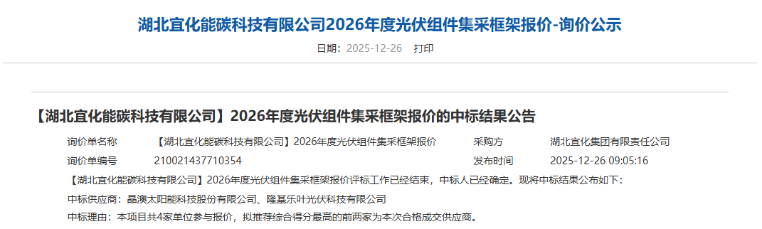 12月26日,湖北宜化能碳科技有限公司2026年度光伏组件集采框架报价的中标结果发布,中标供应商为晶澳太阳能科技股份有限公司、隆基乐叶光伏科技有限公司。