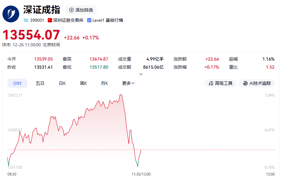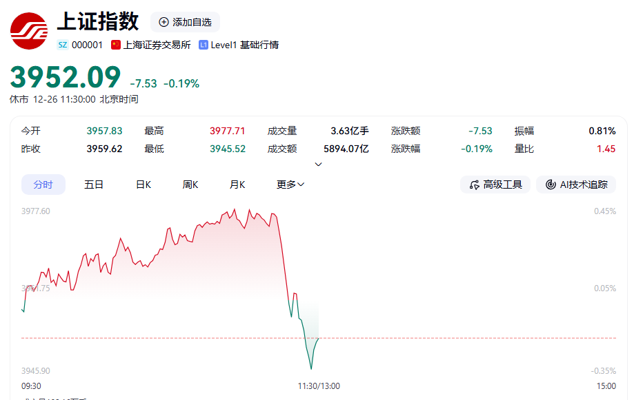 主要股指突然走低。 A股市场今天(12月26日)早盘震荡走强,临近午盘(11:13),主要股指小幅跳水,上证指数、创业板指等翻绿。 盘面上,有色金属和电力设备板块个股掀起涨停潮,成为上午A股市场两大亮点。