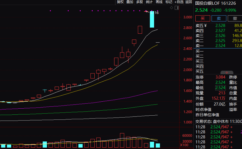 国投白银LOF连续两个跌停 今天市场中,国投白银LOF的表现再度引起关注。 国投白银LOF(161226)今日10:30复牌即跌停,截至上午收盘,仍牢牢封住跌停,这是国投白银LOF连续第二个交易日盘中跌停。