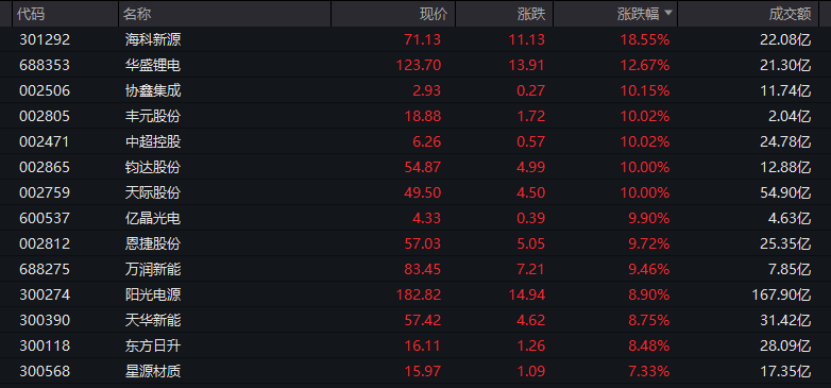 消息面上,今天上午国内多个贵金属期货品种价格大幅上涨,其中铂期货主力合约盘中触及涨停,白银期货主力合约盘中涨幅超过8%。钯期货主力合约盘中涨幅超过9%,后涨幅收窄。 电力设备板块也掀起涨停潮。海科新源一度20%涨停,协鑫集成、中超控股、丰元股份、天际股份等多股涨停。