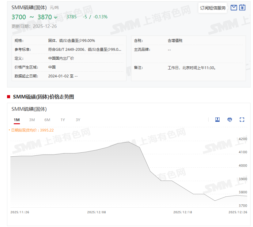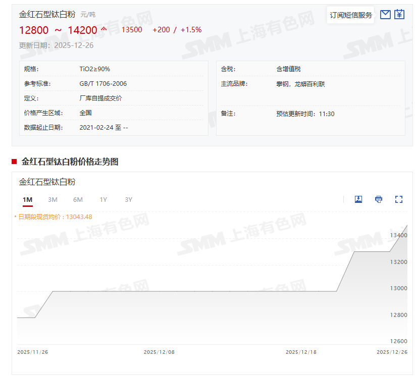 》点击查看SMM硫磺链现货价格 》订购查看SMM金属现货历史价格走势 部分钛白粉企业不得不发布调价函,与硫酸原料的今年以来涨势凶猛有关!从SMM硫磺(固体)的价格走势图可以看出:SMM硫磺(固体)12月26日的均价为3785元/吨,较其12月11日的年内高点4190元/吨相比,下降了405元/吨,跌幅为9.67%。不过,虽然SMM硫磺(固体)在创下4190元/吨的高点后,近期出现了回调,不过,3785元/吨的均价与其2024年12月31日的均价1560元/吨相比,大幅上涨了2225元/吨,其今年以来的涨幅依然高达142.63%! 硫磺价格今年以来的上涨主要受国际供应端紧缩驱动。受地缘政治冲突影响,俄罗斯炼油装置突发减产,作为炼油过程中的核心副产品,硫磺的伴生供应量随之锐减,直接造成全球硫磺市场的基础供应断层;其次,加拿大硫磺矿、中东地区硫磺主产区同步出现产量小幅下滑,进一步加剧了全球硫磺的供需失衡格局,地缘政治冲突以及天然气等价格上涨曾一度驱动硫磺快速攀升至至4000元/吨-4200元/吨。四季度中旬,磷化工企业通过集中检修规避高价原料,叠加行业政策引导,硫磺价格在冲高后企稳并小幅回调至4000元/吨以内。不过,随着冬季备肥以及春耕的需求增加,硫磺供应偏紧态势均将给硫磺价格带来基本面的支撑。 金红石型钛白粉价格26日小幅上涨 今年以来跌6.9%