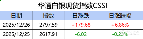 华通白银现货指数CSSI走势日报,今日指数2797.59,日涨跌+179.68,日涨跌幅+6.86%