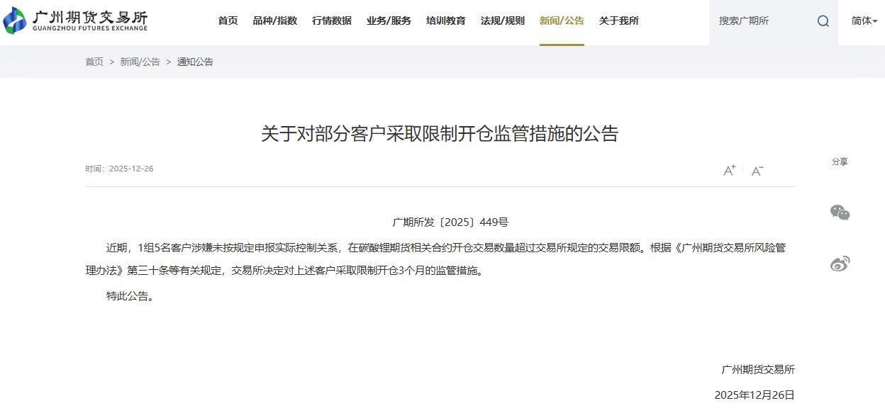 关于对部分客户采取限制开仓监管措施公告 广期所发〔2025〕449号 近期,1组5名客