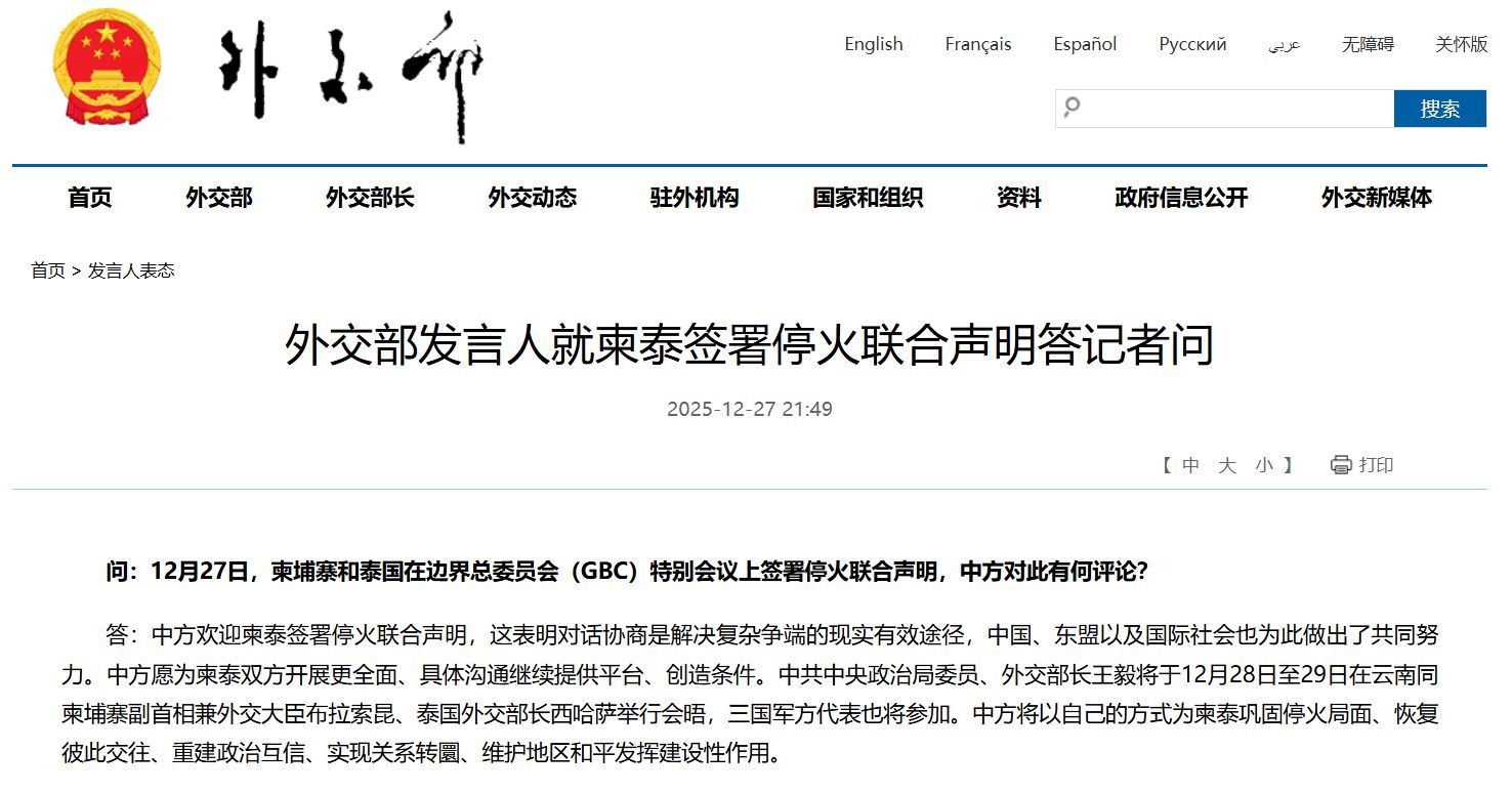 据央视新闻,外交部发言人宣布: 应中共中央政治局委员、外交部长王毅邀请,柬埔寨副首相兼外交大臣布拉索昆、泰国外交部长西哈萨将率团于12月28日至29日赴云南举行会晤。 ![]() 外交部发言人就柬泰签署停火联合声明答记者问。 问:12月27日,柬埔寨和泰国在边界总委员会(GBC)特别会议上签署停火联合声明,中方对此有何评论? 答:中方欢迎柬泰签署停火联合声明,这表明对话协商是解决复杂争端的现实有效途径,中国、东盟以及国际社会也为此做出了共同努力。中方愿为柬泰双方开展更全面、具体沟通继续提供平台、创造条件。中共中央政治局委员、外交部长王毅将于12月28日至29日在云南同柬埔寨副首相兼外交大臣布拉索昆、泰国外交部长西哈萨举行会晤,三国军方代表也将参加。中方将以自己的方式为柬泰巩固停火局面、恢复彼此交往、重建政治互信、实现关系转圜、维护地区和平发挥建设性作用。 ![]()