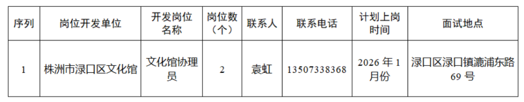 报名时间 2025年12月29日-2025年12月31日17:00,逾期不再接受报名。 报名方式 报名地点:浏阳市卫生健康局4216会议室(地址:浏阳市行政中心附二栋二楼)。 株洲市渌口区2025年城镇公益性岗位招聘计划 招聘岗位