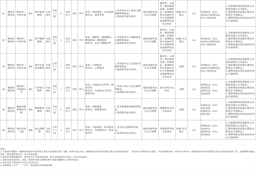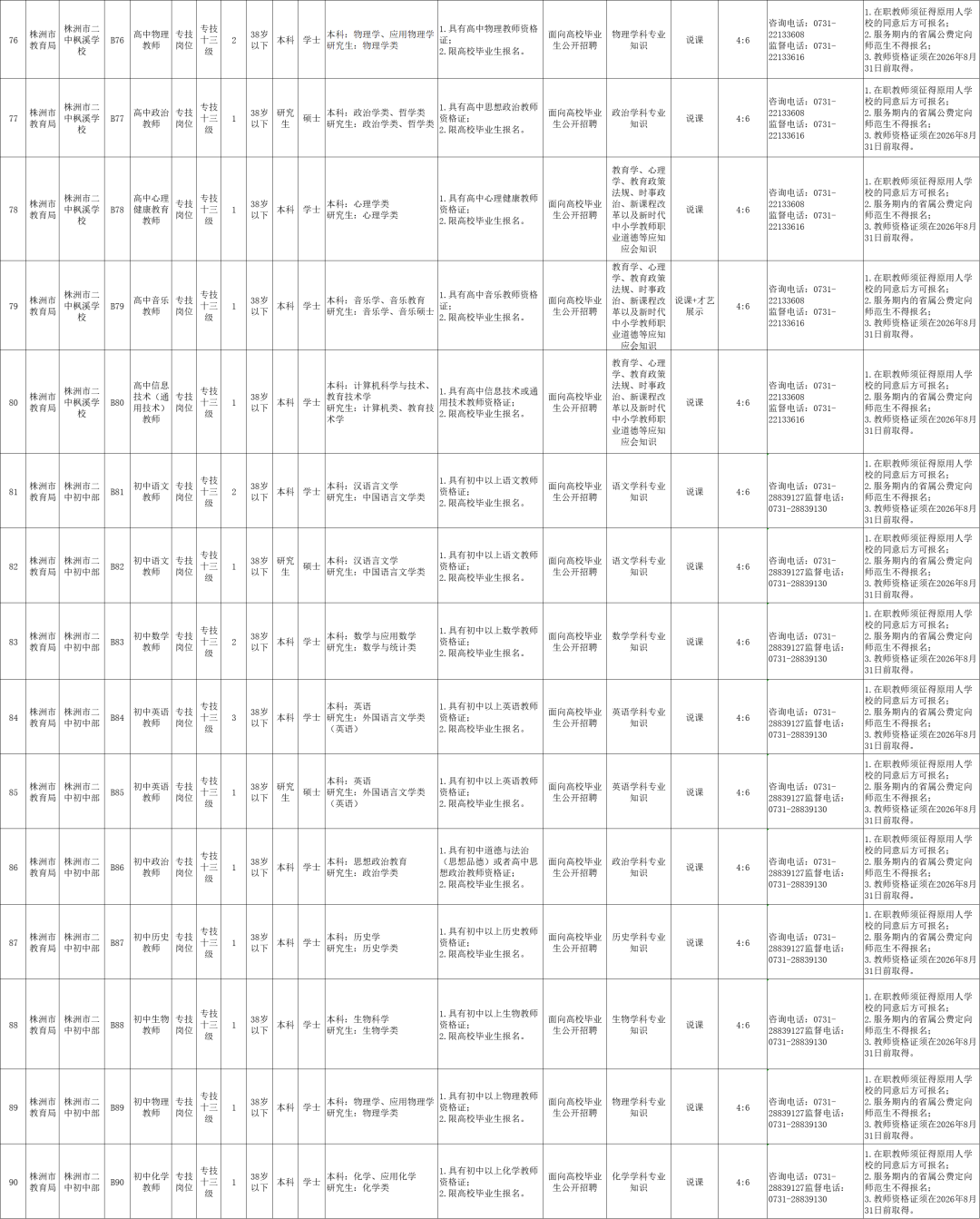 报名时间 2025年12月26日上午9∶00-2026年1月6日下午17∶00。 招聘岗位 请应聘人员登录株洲教育网→点击“2026年株洲市教育局直属学校面向高校毕业生公开招聘教师报名入口”→注册并登录报名系统进行报名。 衡阳县2025年卫健系统公开招聘专业技术人员公告 招聘岗位