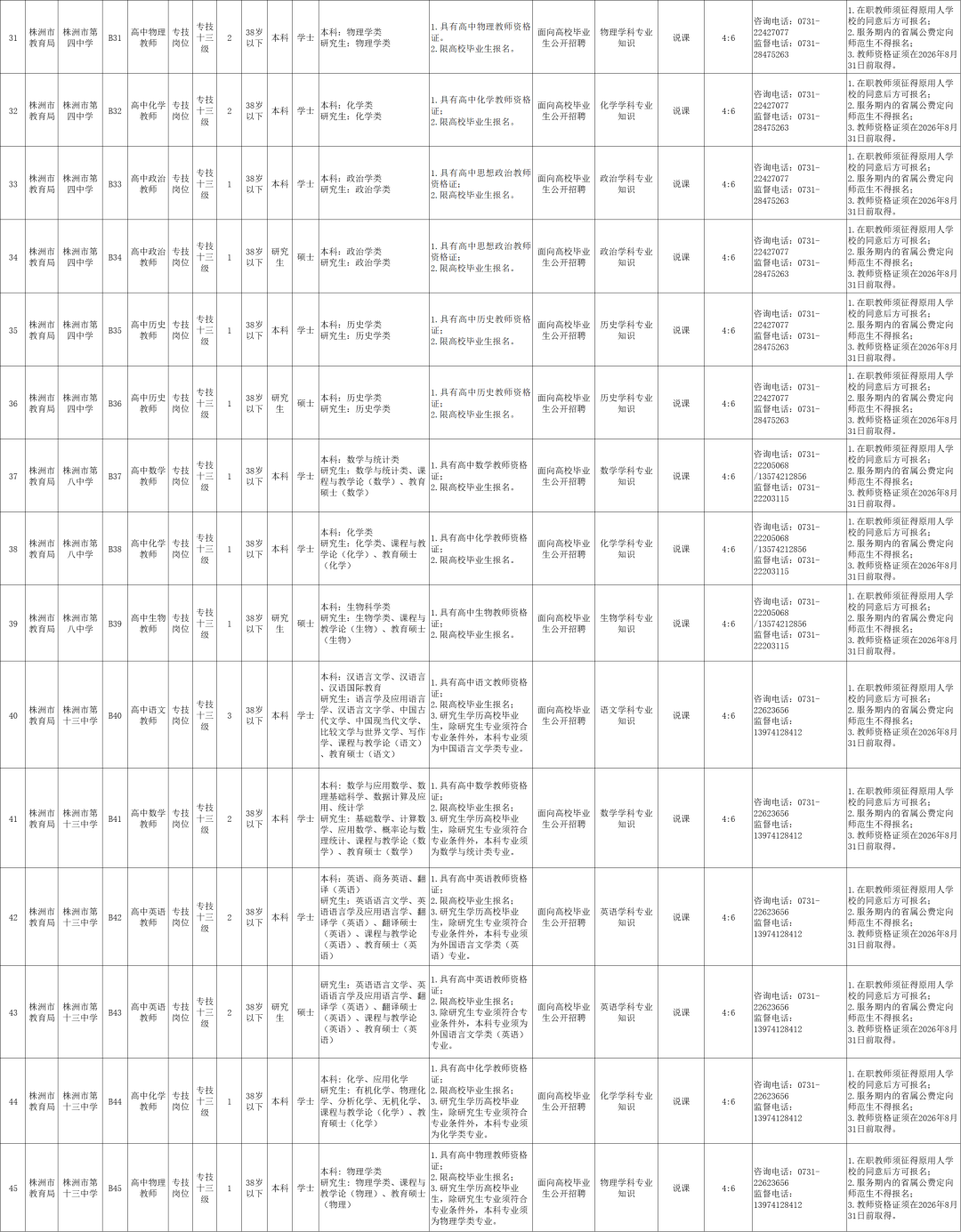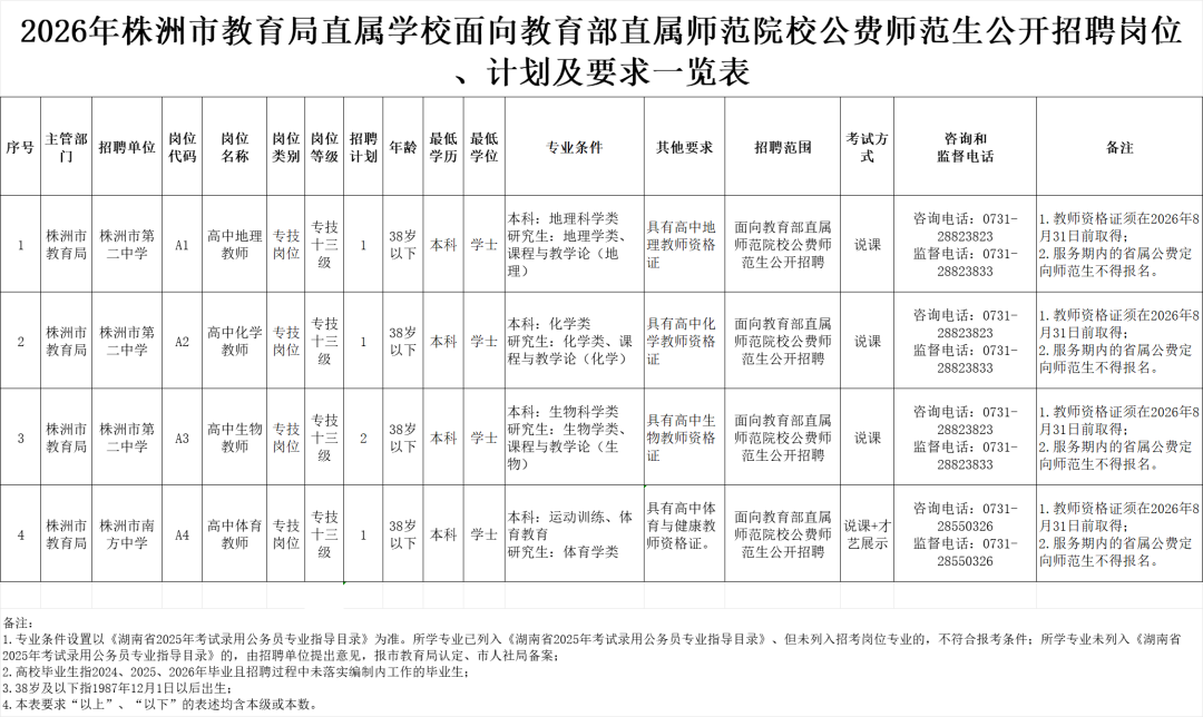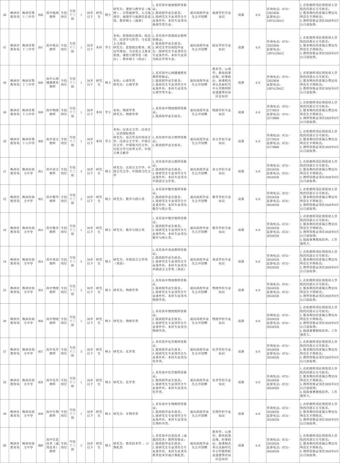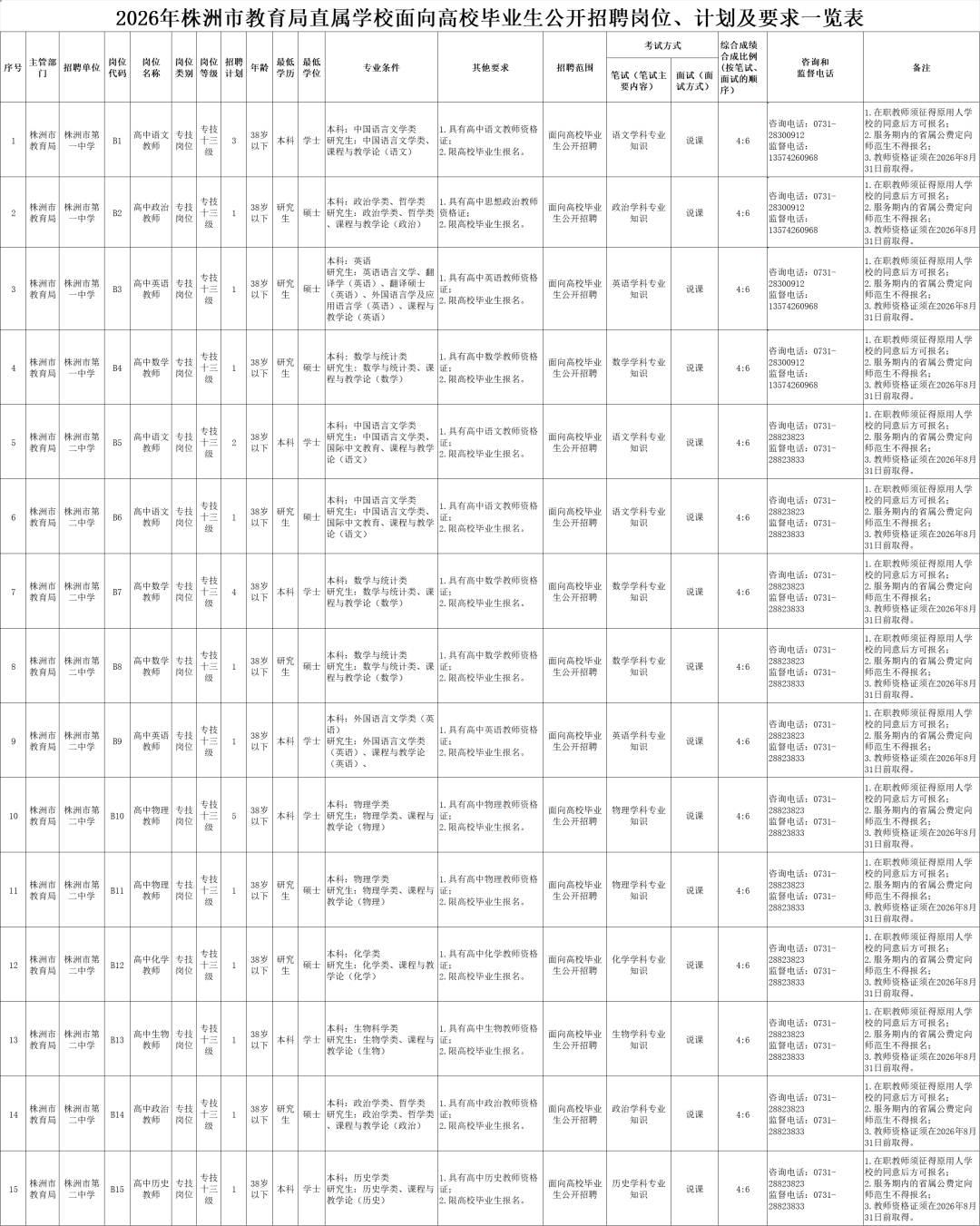 报名时间 2025年12月29日8:00至12月31日17:30,2026年1月4日8:00-1月5日17:30(仅工作日接受报名) 报名方式 报名地点:怀化市教育局阳光服务大厅。 2026年株洲市教育局直属学校面向高校毕业生公开招聘教师公告 招聘岗位