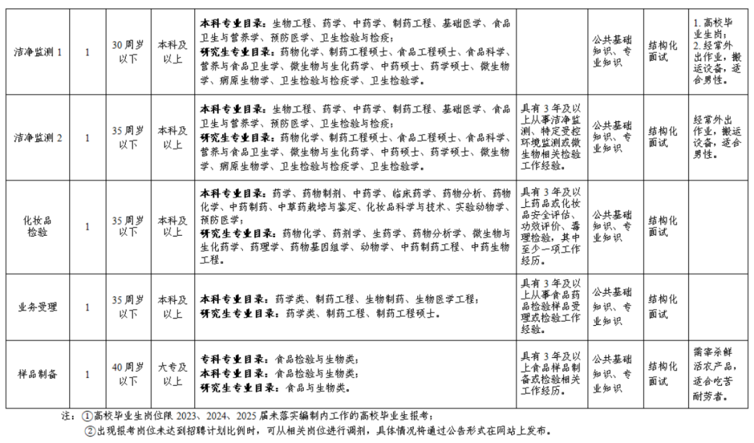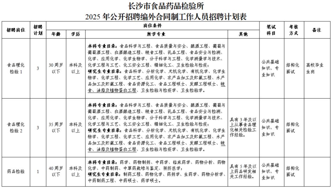 报名时间 2025年12月22日9:00至12月31日17:00。 报名方式 报名网址:https://zpks.sun-hrm.com/nindex/?ecode=2025nylx 长沙市食品药品检验所2025年公开招聘编外合同制人员简章 招聘岗位