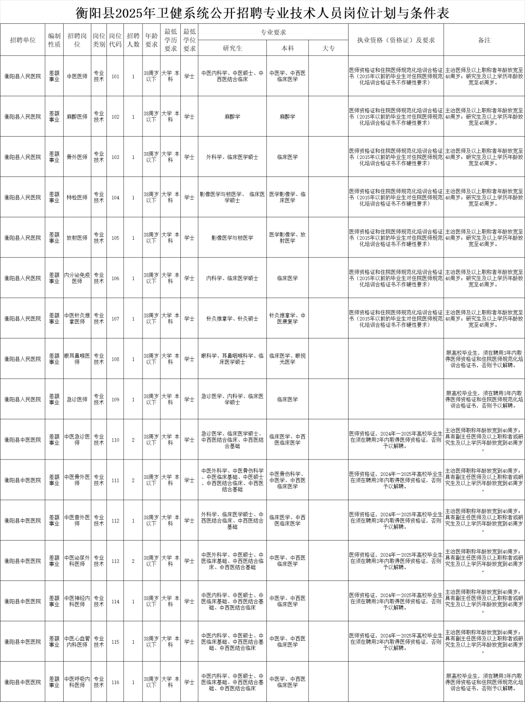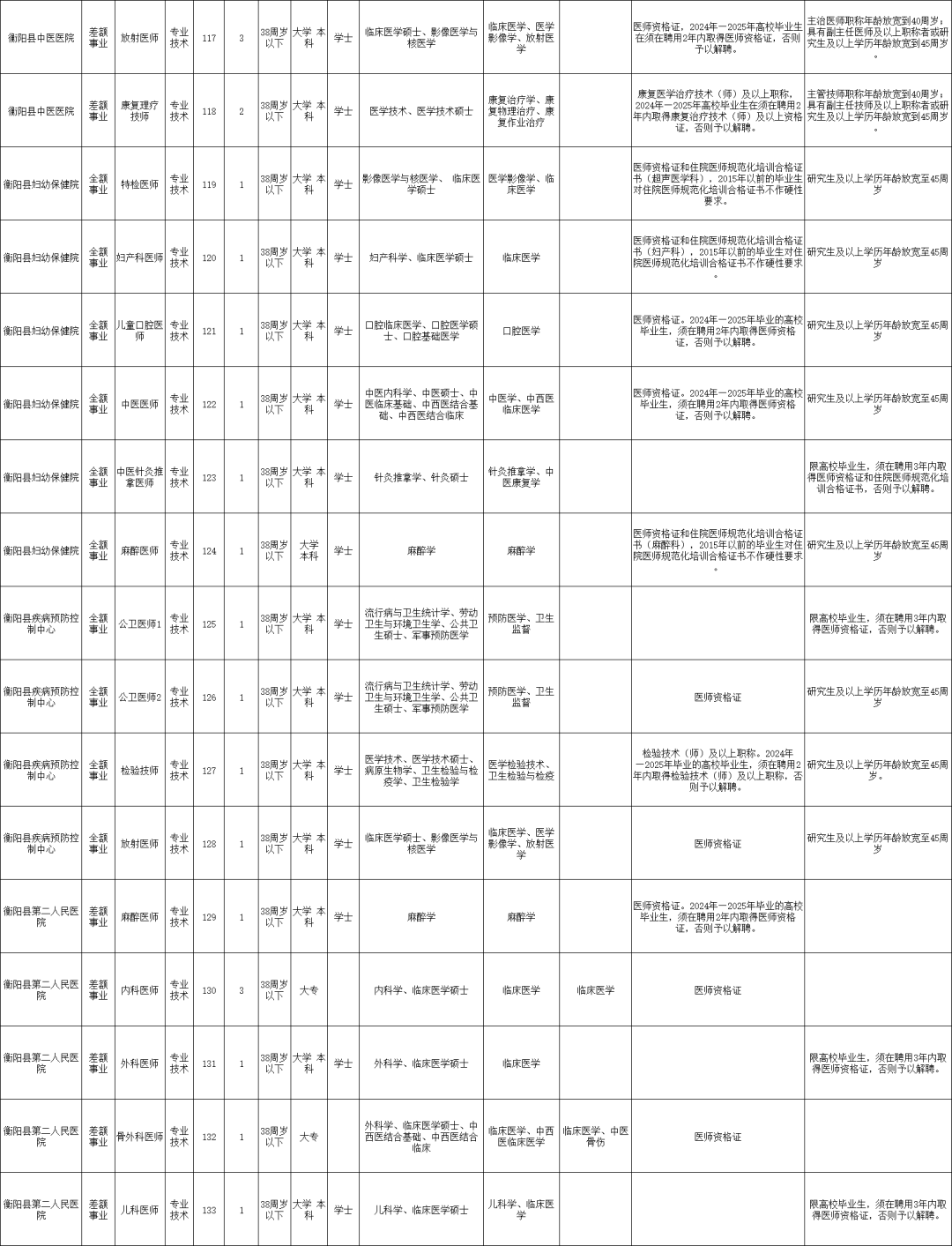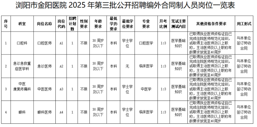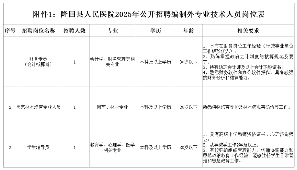 报名时间 2025年12月26日-12月30日上午8:00-12:00;下午2:00-5:00(周末除外)。 报名方式 劳务派遣:浏阳市金阳医院门诊三楼报告厅(地址:浏阳市经开区永福路179号,联系人:张瑞文,电话:15675111565)。 编外合同制人员:报名地点:浏阳市金阳医院门诊三楼会议室(地址:浏阳市经开区永福路179号,联系人:朱雪梅,电话:13786174554)。 隆回县人民医院2025年公开招聘编制外专业技术人员公告 招聘岗位
