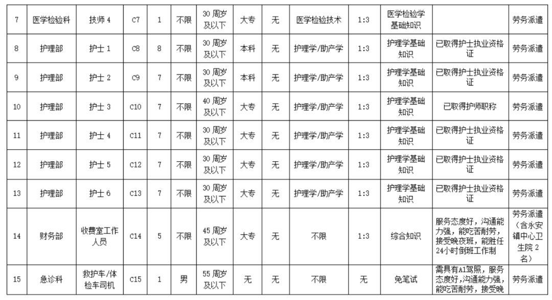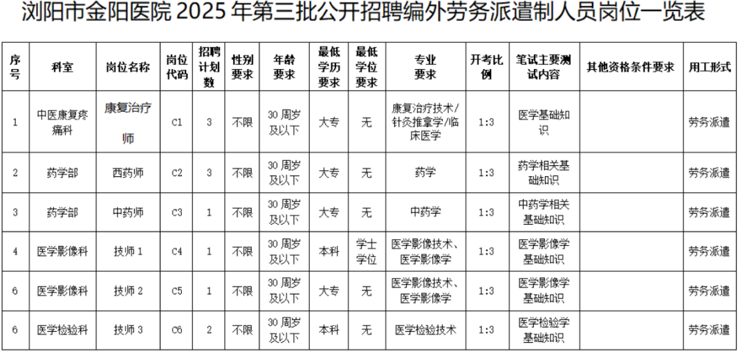 报名时间 2025年12月29日-12月31日(工作日上午8:00-12:00,下午14:00-17:00)截止。 报名方式 报名地点:浏阳市人民医院4号楼9楼人力资源部(地址:浏阳市道吾山西路452号,联系人:刘红 电话:0731-83666546)。 关于浏阳市金阳医院、浏阳市永安镇中心卫生院 2025年第三批公开招聘编外劳务派遣人员的公告 招聘岗位