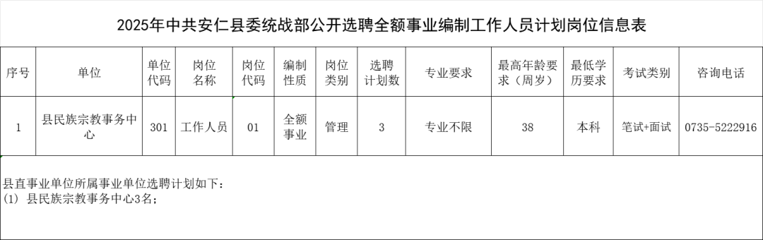 报名时间 2026年1月6日9:00至2026年1月12日17:00。 报名方式 报考者登录人事考试报名网(www.dcpta.com.cn)报名。 中共安仁县委统战部县内公开选聘全额事业编制工作人员公告 招聘岗位