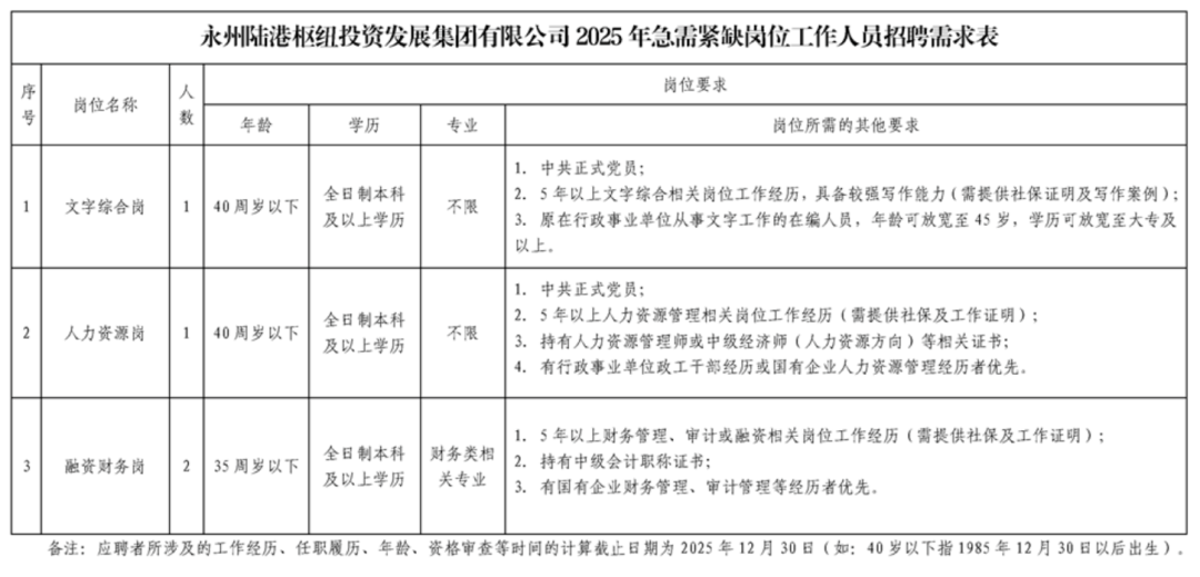 报名时间 2025年12月25日(周四)上午9:00—2026年1月4日(周日)17:00。 报名方式 报名网站:http://www.hnrlzyfw.com/hncsspypjyszp2025 永州陆港枢纽投资发展集团有限公司公开招聘工作人员的公告 招聘岗位