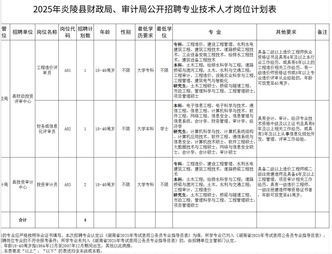 报名时间 2026年1月21日截止 报名方式 相关报名资料以“姓名-长沙分行-**岗位”命名,请将简历发送至hfcszhaopin@163.com进行简历投递。 2025年炎陵县财政局、县审计局公开招聘专业人才公告 招聘岗位