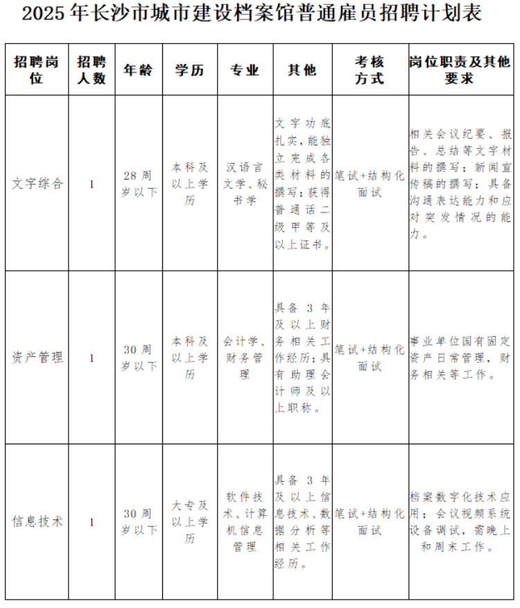 报名时间 2026年1月12日截止。 报名方式 相关资料发送至邮箱134333@csu.edu.cn。 长沙市城市建设档案馆2025年公开招聘普通雇员简章 招聘岗位