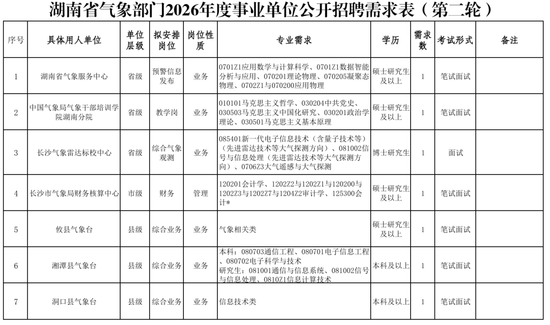 湖南省气象部门2026年度事业单位公开招聘应届毕业生公告(第二轮)(第2604号) 招聘岗位