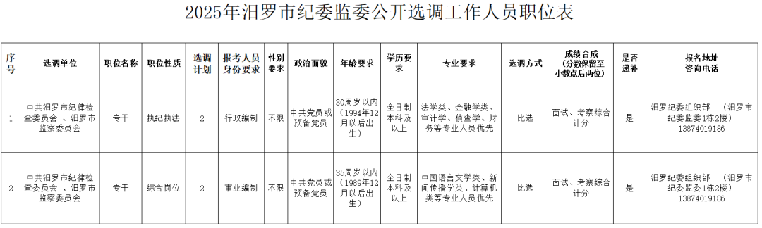报名时间 2025年12月23日-12月31日工作时间 报名方式 报名地点:中共安仁县委统战部办公室(县行政中心A627室)。 汨罗市纪委监委2025年公开选调工作人员公告 招聘岗位