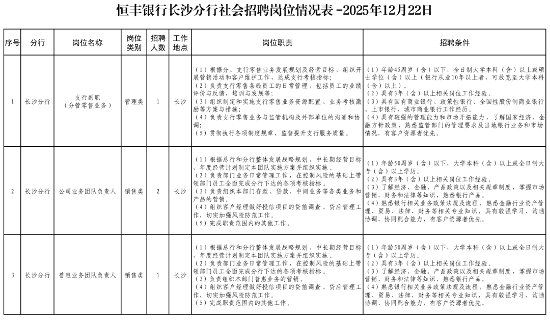 报名时间 2025年12月31日至2026年1月8日 报名方式 报名地址:湖南省汨罗市纪委监委组织部(汨罗市归义街道站前路128号) 恒丰银行长沙分行社会招聘启事 招聘岗位