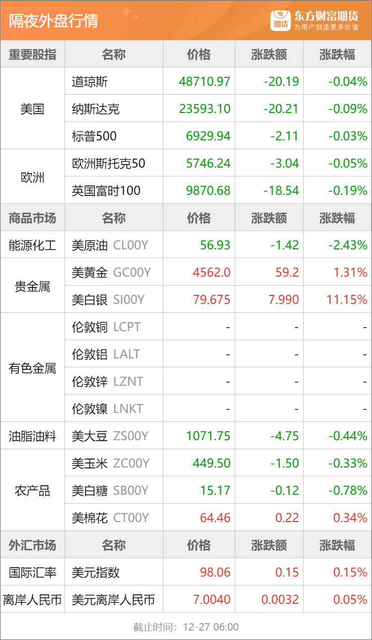 隔夜行情![]() ![]() 12月26日,因圣诞节假期,伦敦证券交易所当日休市无行情。 每日精选金银铂集体疯涨再破纪录:避险情绪点燃贵金属年末狂欢 尿素市场缘何呈现“内外分化”格局? 2025光伏行业盘点:“反内卷”推动价格回稳企业自救提速 宏观产经新华社:全国人大常委会会议12月27日表决通过了关于召开十四届全国人大四次会议的决定。根据决定,十四届全国人大四次会议于2026年3月5日在北京召开。政协第十四届全国委员会日前召开主席会议,建议全国政协十四届四次会议于2026年3月4日在北京召开。 财政部网站:12月27日至28日,全国财政工作会议在北京召开。会议要求,2026年要坚持内需主导,支持建设强大国内市场。大力提振消费,深入实施提振消费专项行动。积极扩大有效投资,加大对新质生产力、人的全面发展等重点领域投入。加快推进全国统一大市场建设,规范税收优惠、财政补贴政策。支持科技创新和产业创新深度融合,加快培育壮大新动能。进一步增加财政科技投入,完善财政科技经费管理,强化企业科技创新主体地位。 国家统计局:1-11月份,全国规模以上工业企业实现利润总额66268.6亿元,同比增长0.1%(按可比口径计算)。1-11月份,规模以上工业企业中,国有控股企业实现利润总额20083.6亿元,同比下降1.6%;股份制企业实现利润总额49565.6亿元,下降0.4%;外商及港澳台投资企业实现利润总额16355.3亿元,增长2.4%;私营企业实现利润总额19319.9亿元,下降0.1%。 品种资讯黑色系期货 铁矿石:12月26日Mysteel统计全国45个港口进口铁矿库存总量15858.66万吨,环比增加346.03万吨;日均疏港量315.06万吨,增1.61万吨;在港船舶数量103条,降8条。全国47个港口进口铁矿库存总量16619.96万吨,环比增加394.43万吨;日均疏港量328.76万吨,增0.53万吨。(我的钢铁网) 锰硅:锰硅前期点火炉子陆续开始出铁,部分产区也有复产情况,近期总产量小幅回升。本周(12月22日至12月26日)Mysteel统计全国187家独立硅锰企业样本开工率为36.78%,较上周增加1.17%;日均产量为27510吨,环比增加620吨。(我的钢铁网) 硅铁:本周(12月22日至12月26日)Mysteel全国136家独立硅铁企业开工率为29.5%,环比上周减少0.8%;日均产量为14065吨,环比上周减1.30%,减185吨,处近6个月来最低水平。(我的钢铁网) 农产品期货 生猪:12月26日,全国农产品批发市场猪肉平均价格为17.43元/公斤,与上周五(12月19日)的17.53元/公斤相比,下降0.6%。本周的平均价格为17.46元/公斤,与上周17.45元/公斤的均价相比,基本持平。(澎湃新闻) 大豆:据Mysteel,12月20日至12月26日,国内油厂大豆实际压榨量206.44万吨,较前一周实际压榨量减6.62万吨,较预估压榨量低5.62万吨;实际开机率为56.79%。(我的钢铁网) 棕榈油:船运调查机构SGS公布数据,预计马来西亚12月1-25日棕榈油出口量为824276吨,较上月同期出口的583574吨增加41.25%。(新华财经) 棉花:12月26日,国家统计局发布2025年棉花产量公告,我国棉花主产区新疆棉花产量首次突破600万吨,总产达616.5万吨,占全国产量的92.8%。公告显示,新疆棉花播种面积3887.5万亩,棉花(皮棉)单产为158.6公斤/亩,较上年均有小幅上涨,单产高出全国棉花平均单产10公斤/亩。(新华社) 有色/贵金属期货 贵金属:受避险需求增加等因素拉动,国际黄金、白银价格26日再创新高。其中,交投最活跃的2026年2月黄金期货价格一度达到每盎司4581.30美元,3月白银期货价格突破每盎司79美元,逼近80美元。(新华社) 特斯拉首席执行官埃隆·马斯克对白银价格上涨表示担忧。他在社交媒体平台发帖称:“这可不好。白银在许多工业生产过程中都必不可少。”他此番言论是对一篇描述白银价格因“全球供应严重短缺而暴涨”的帖子的回应。近期,白银价格大幅上涨,过去一周飙升了逾17%。(财联社) 沪铅:数据显示,截至2025年12月26日,规模再生铅企业综合盈亏理论值为287元/吨,中小规模再生铅企业综合盈亏理论值为77元/吨(模型中的副产品收益不包括锡、锑)。(上海有色网) 多晶硅:截至12月26日,本周多晶硅(N型致密料)市场均价50元/千克,生产成本约40.95元/千克,净利为9.05元/千克。价格方面,本周多晶硅N型致密料均价环比持平。成本方面,硅粉价格下降,成本环比下降0.63元/千克。本周多晶硅环节净利润环比上涨0.63元/千克。(我的钢铁网) 能化期货 原油:据报道,伊拉克、库尔德地区与国际公司达成协议,延长石油出口协议三个月至明年3月31日。(财联社) 当地时间25日傍晚,美国总统特朗普表示,在其命令下,美军对尼日利亚西北部“伊斯兰国”目标发动“强大且致命”的打击。值得关注的是,尼日利亚是非洲最大的石油生产国,也是石油输出国组织(欧佩克)成员国之一。(证券时报网) 燃油:新加坡企业发展局(ESG)数据显示,截至12月24日当周,新加坡燃料油库存增加105.8万桶达到两周高点的2571.6万桶。(新华财经) PVC:截至12月26日,中国PVC生产企业厂库库存可产天数在5.1天,环比减少3.77%,企业检修及交付高预售订单,在途货源量增加,在库天数环比下降。(隆众资讯) 其他期货 欧线集运:上海航运交易所数据显示,截至12月26日,上海出口集装箱运价指数(综合指数)报1656.32点,与上期相比上涨103.40点;中国出口集装箱运价综合指数报1146.67点,与上期相比涨2.0%。(财联社) 环球视野财联社:泰国和柬埔寨边界总委员会第三次会议当地时间12月27日在泰国尖竹汶府边境口岸举行。会议发表联合声明承诺,双方从当天12