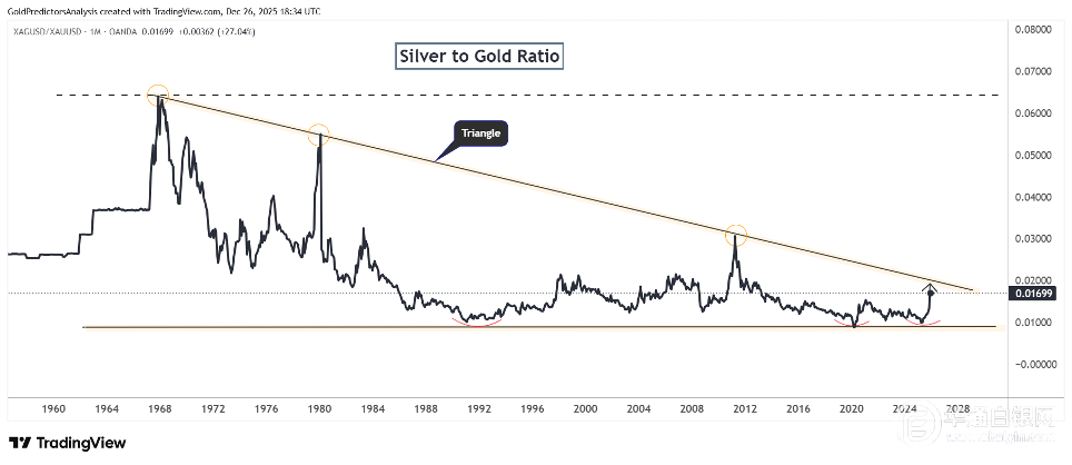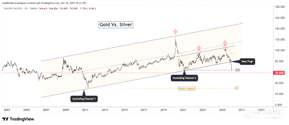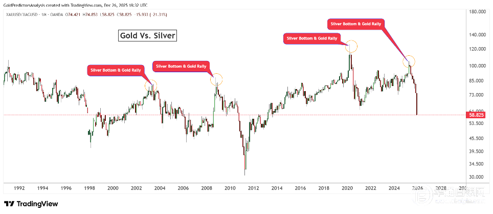 如果银价出现向30-50美元区间的回撤,对投资者来说可能是一个长期买入机会。该区域被认为是一个关键的积累区,受到数十年阻力和近期看涨势头的支撑。长期投资者可能将回调至该区间视为进一步上涨的机会。 市场间比率表明白银在下一个牛市阶段处于领先地位 金银比崩溃预示着白银的追赶反弹