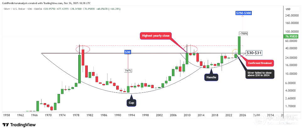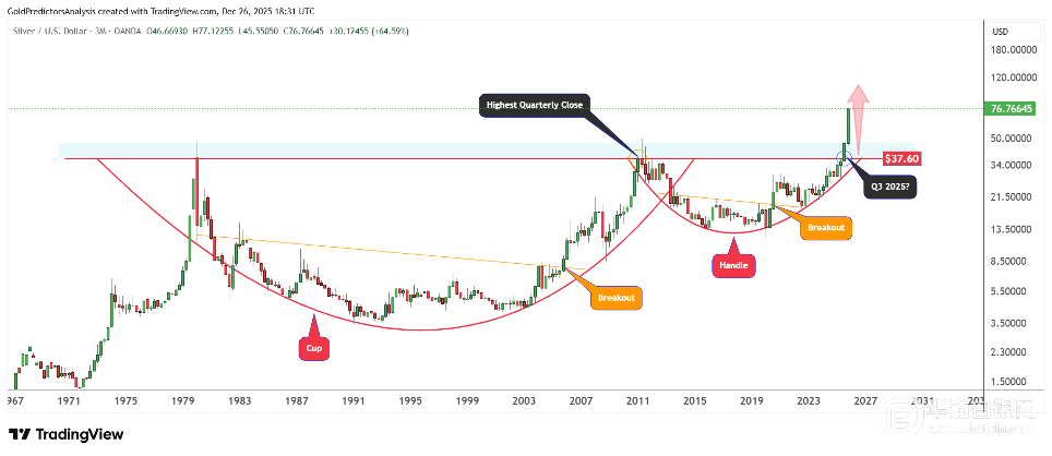 这种数十年的整合形成了一个经典的杯柄模式,白银在2025年打破了这一模式。此外,31美元的水平也是一个关键的障碍,在过去的40年里,没有一年的收盘价高于这个水平。从历史上看,每次突破31美元之后都会出现飙升和大幅下跌。然而,近期银价持续位于30美元上方,表明2025年市场格局可能发生变化。 2025年杯柄形态的突破预计将带来超过700%的涨幅,这与1993年低点至31美元高点的747%涨势相似。若以30美元的突破点位起算,这一走势指向250至300美元的潜在目标区间。然而,首个主要阻力位于100美元心理关口,该水平可能在2026年经受考验。整体来看,白银价格在未来一年有望进一步上涨。 杯柄模式反映了长期的价格压缩,在50美元以下的盘整水平作为杯内的压力建立阶段。2025年的突破类似于积聚势头的爆炸性释放。 这一突破标志着白银价格行为的重大转变,预示着持续上行的新阶段。该结构暗示,随着看涨趋势的展开,未来几个月和几年,白银相对于黄金可能会获得牵引力。 白银突破50美元提供新的布局空间 为更清晰把握白银市场近期动态,下方季度走势图显示,白银历史最高季度收盘价纪录为37.65美元。值得注意的是,2025年第三季度的收盘价已触及这一历史水平。 基于此次突破,白银价格极有可能在2025年创下史上最高年度收盘价。图表清晰显示,2025年第三季度白银收于46.64美元,恰好位于蓝色阻力区域的上沿。这标志着价格已有效突破关键阻力位,为2026年初的潜在上涨行情奠定了基础。