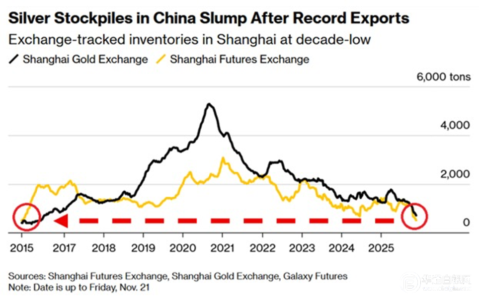 【华通白银网12月29日】•白银在突破长达40年的盘整形态后,正朝着2026年100美元的目标价位迈进。 •金银比的关键支撑位宣告失守,预示着白银相对于黄金的超额表现将持续。 •飙涨的工业需求与美联储重启资产负债表扩张,是推动这一结构性价格重估的核心宏观驱动力。 白银在2025年突破长期阻力位50美元后飙升,标志着市场行为的明显转变。此举反映的是结构性变化,而非投机性飙升。由实物供应收紧、工业需求加速以及全球流动性周期重新开始所推动。本文将探讨宏观经济力量、技术结构和市场间信号,这些因素将影响白银在2026年的下一个重大走势。 宏观力量重塑白银供需平衡 中国白银外流与全球供应紧张加剧 供给侧继续恶化,而中国处于这一转变的中心。上海期货交易所仓库的白银库存已降至715吨。这是自2016年7月以来的最低水平。这标志着从2020年峰值下降了86%。