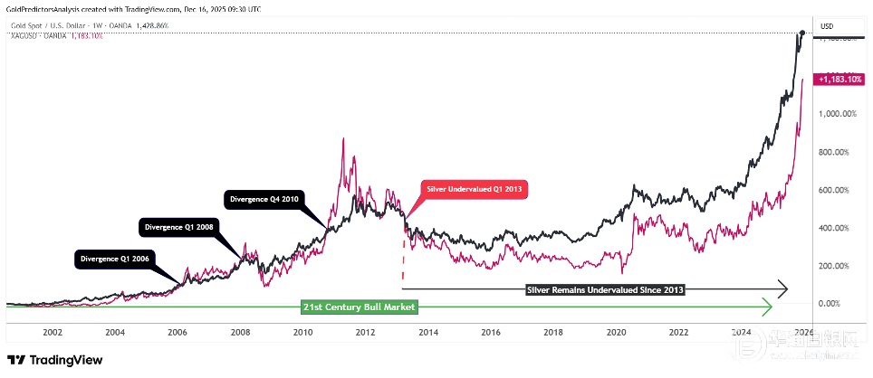 这种看跌的延续和比率的突破表明这两种金属都有持续的看涨势头,在中短期内白银表现或将超过黄金。 下图证实了21世纪黄金和白银价格之间的强烈相关性。白银在2025年开始赶上黄金的涨势,但相对于黄金而言仍被低估。从历史上看,当黄金与白银的比率继续下降时,白银价格会急剧上涨。这种动态可能会持续到2026年,这表明随着白银赶上黄金在2024-2025年上涨期间建立的势头,白银的走势可能会快于黄金。