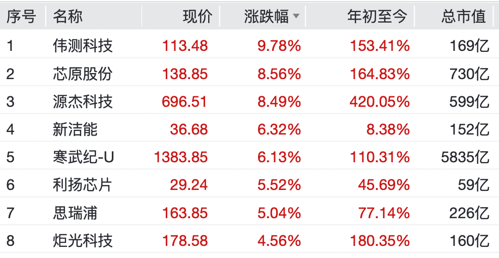 消息面上,据新华社消息,工业和信息化部人形机器人与具身智能标准化技术委员会成立大会日前在京举行。标委会的成立是发挥标准引领作用,加强高质量标准供给,推动人形机器人与具身智能技术熟化和应用落地的重要举措。 标委会将主要承担人形机器人与具身智能基础共性、关键技术、部组件、整机与系统、应用、安全等领域行业标准制修订工作,引导产业健康发展。 半导体板块震荡上扬 半导体板块震荡上扬。个股方面,芯原股份一度涨超9%,中芯国际涨近2%,寒武纪-U涨超6%,东微半导涨超10%,伟测科技、源杰科技涨超8%。