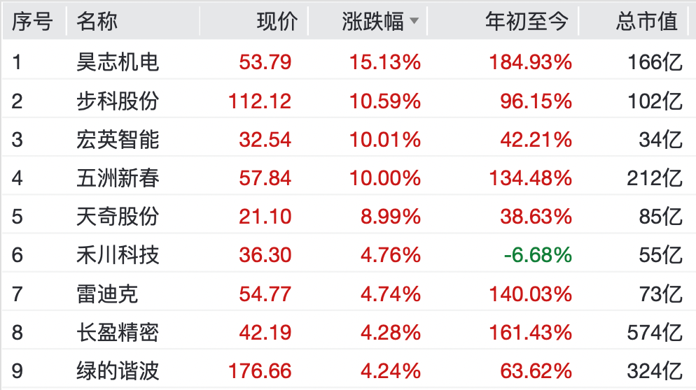 人形机器人概念股异动拉升 人形机器人概念股异动拉升。个股方面,宏英智能、五洲新春录得10cm涨停,上纬新材涨超18%,昊志机电涨超15%,步科股份、天奇股份、长盈精密、绿的谐波、雷迪克、兆威机电跟涨。