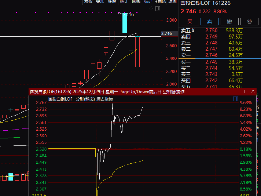 今年以来,国投白银LOF累计涨幅已经超过200%。12月来更是加速上涨,截至发稿,国投白银LOF本月累计涨幅接近80%。 国投瑞银基金管理有限公司此前发布公告称,近期,国投瑞银基金管理有限公司(以下简称“本基金管理人”)旗下国投瑞银白银期货证券投资基金(LOF)A类基金份额(场内简称:国投白银LOF;交易代码:161226,以下简称“本基金”)二级市场交易价格波动较大,请投资者密切关注基金份额净值。2025年12月25日,本基金基金份额单位净值为1.9469元,截至2025年12月26日,本基金二级市场的收盘价为2.524元,明显高于基金份额净值,投资者如果盲目投资于高溢价率的基金份额,可能面临较大损失。 公告称,为保护投资者利益,本基金将于2025年12月29日开市起至当日10:30停牌,自2025年12月29日10:30复牌。若本基金2025年12月29日二级市场交易价格溢价幅度未有效回落,本基金有权通过向深圳证券交易所申请盘中临时停牌、延长停牌时间的方式,向市场警示风险,具体以届时公告为准。 公告还称,本基金管理人声明如下: 1. 本基金为上市开放式(LOF)基金,除可在二级市场交易外,投资者还可以申购、赎回本基金,申购、赎回价格以申请当日收市后计算的基金份额净值进行计算,投资者可通过基金管理人网站或交易行情系统查询本基金的最新份额净值。 2. 目前,本基金A类基金份额申购金额上限为100.00元。后续,本基金管理人将调整A类基金份额申购限额,本基金二级市场价格的高溢价率不具备可持续性,敬请特别关注。 3. 截至目前,本基金运作正常。本基金管理人仍将严格按照法律法规及基金合同的相关规定进行投资运作。 4. 截至目前,本基金无其他应披露而未披露的重大信息。本基金管理人仍将严格按照有关规定和要求,及时做好信息披露工作。 5. 本基金二级市场的交易价格,除了有基金份额净值波动的风险外,还会受到市场供求关系、系统性风险、流动性风险等其他因素的影响,可能使投资者面临损失。 此外,国投白银LOF还发布公告,为保护基金份额持有人利益,国投瑞银白银期货证券投资基金(LOF)C类基金份额将从2025年12月29日开始暂停申购。本基金取消或调整2025年12月29日起的暂停C类基金份额申购(含定期定额投资)业务的具体时间将另行公告。 今日早间,国际贵金属市场亦大幅波动,白银现货盘初一度大涨超5%,随后直线跳水,一度跌约5%,此后再度震荡走高转涨,截至发稿,涨幅约1.2%。