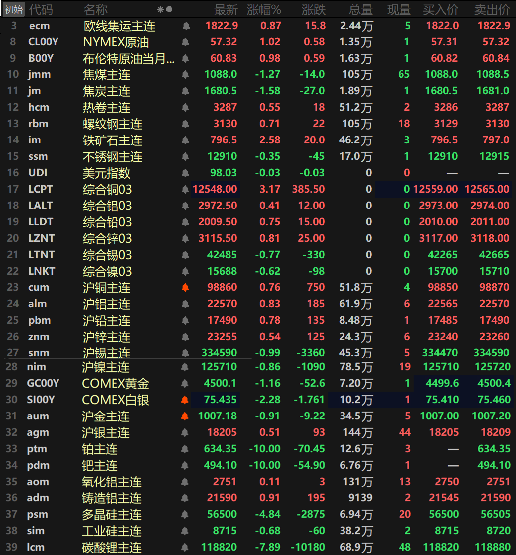 SMM 12月29日讯: 金属市场: 截至日间收盘,内盘基本金属集体回落,沪锡、沪镍一同飘绿,沪锡跌0.99%,沪镍跌0.86%。沪铜也在早些时候疯狂过后涨幅明显收窄,涨0.76%,沪铝涨0.83%,沪铅涨0.78%,沪锌涨0.54%。氧化铝主连主涨0.1%,铸造铝主连涨0.91%。 此外,碳酸锂主连午后一路走低,盘中一度触及跌停,截止收盘,其以7.89%的跌幅报118820元/吨。工业硅主连跌0.68%,多晶硅主连跌4.84%。欧线集运主连涨0.87%报1822.9。 黑色系方面涨跌互现,不锈钢跌0.35%,铁矿以2.58%的涨幅领涨,螺纹、热卷涨幅均在1%以内。双焦一同跌超1%,焦煤跌1.27%,焦炭跌1.58%。 外盘金属方面,截至15:02分,外盘伦铜以3.17%的涨幅领涨,伦锌涨0.81%,伦锡、伦镍跌幅均在1%以内。 贵金属方面,截至15:02分,COMEX黄金跌1.16%,COMEX白银跌2.28%。国内方面,沪金跌0.91%,沪银涨幅收窄至0.51%。 此外,铂、钯主连一同跌停,铂主连以10%的跌幅报634.35元/克,钯主连以10%的跌幅报494.1元/克。 截至今日15:02分行情