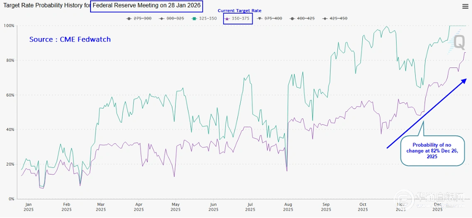 芝加哥商品交易所的美联储观察工具 当前目标利率3.50-3.75 芝加哥商品交易所的美联储观察工具显示,1月不加息的可能性从2025年12月23日的86.7%上升至82.3%。 2月份不加息的可能性从2025年12月23日的54.4%降至48.3%。