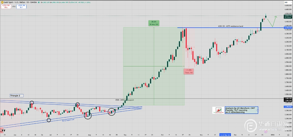技术分析 早些时候,现货黄金触及4,450美元/盎司的历史新高。从技术角度来看,在进一步走高之前,金价通常会重新测试先前的突破记录区域4381.50-4375美元。然而,月份、季度和年底的动态可能会改变通常的模式。金银比正处于2013年9月以来的最高水平,似乎有些紧张。 黄金日线图