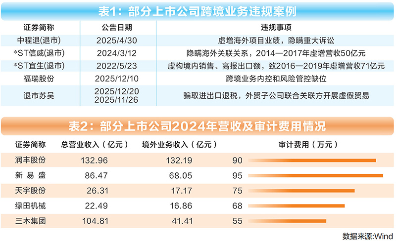 证券时报记者 胡敏文 12月30日,江苏吴中因重大违法进入摘牌倒计时。近年来,青岛中程、信威集团等企业,均因境外业务违规遭监管处罚,部分已被强制退市。相关案例暴露出的虚构跨境交易、资金体外循环等舞弊手法,亟待引起各方关注。 随着上市公司境外收入占比走高,跨境经营已成为企业发展的重要方向。据证券时报记者统计,2024年超过一半的上市公司(非金融类,下同)涉及跨境业务,境外收入占比超过30%的上市公司超过1100家。跨境业务兼具复杂性与地域特殊性,极易滋生财务舞弊行为。 作为资本市场守门人的审计行业,一边面对着日益复杂的审计任务,另一边却深陷低价竞争困境,审计收费与审计难度不匹配的矛盾突出。时值2025年年报审计全面铺开之际,如何破解困局、应对境外舞弊隐患,成为重大现实挑战。 跨境舞弊行为 不易被察觉 近年来,我国对外经济合作全面深化,海外业务成为很多企业拓展全球市场、实现战略布局的重点所在。 据证券时报记者统计,2024年A股上市公司境外业务收入总计10.52万亿元,占到了总营收的17%;与2020年相比,2024年上市公司境外收入总规模增长了61%。进一步数据显示,2024年总营收超10亿元且境外收入占比超过30%的上市公司有810家。 截至目前,已有多家上市公司因境外收入造假受到监管处罚(表1)。此类案件往往伴随着对审计机构及相关会计师的追责。以宜华生活造假案为例,该公司通过虚构境内销售业务、高报出口销售额等方式,2016—2019年合计虚增营业收入近71亿元。2025年4月7日,上交所对正中珠江会计师事务所及三位会计师作出行政处罚,核心事由指向其在该审计项目中的履职缺陷,包括未充分获取境外销售相关审计证据,对境外销售业务销售与收款的控制测试执行不到位,外销客户回款实质性程序执行不当等问题。 跨境业务规模的持续扩张,让境外项目审计风险日益突出。 “从已公开的行政处罚案例看,境外收入造假通常具有隐蔽性强、核查难度大的特点,但实施难度因企业内部控制完善程度与审计应对力度而异。造假手段往往围绕虚构跨境交易、操纵业务进度、伪造单据闭环、利用复杂架构隐瞒关联关系等展开。由于跨境要素如货物物流、资金流转、客户身份等,验证链条长且易受地域阻隔,舞弊行为可能在较长时间内不被察觉,一旦暴露,涉及的财务影响和市值损失通常十分巨大,对企业、审计机构及相关责任人的法律与声誉风险也极高。”南京审计大学创业学院院长许汉友说。 中审众环会计师事务所执行事务合伙人杨荣华指出,相较于境内业务,境外业务舞弊风险更高。跨境交易链条长,离岸公司、第三方代理等主体比较多,这类主体很容易被用于虚构收入等造假行为。 锦天城律师事务所律师顾春峰也强调,跨境资金循环、虚假合同等行为很容易规避核查,会导致整体风险极高。 跨境审计 难度大成本高 摆在审计端的现实挑战同样严峻,多位业内资深人士坦言,跨境审计面临开展难度大、投入成本高的双重压力,实操推进阻碍重重,整体成本更是远超境内审计项目。 谈及跨境审计的核心难点,顾春峰分析,主要集中在四大方面:一是证据获取难度大,境外凭证的真实性很难核查,跨境函证的效率也偏低;二是合规差异问题突出,不同国家有着不同的会计准则与税务法规,审计工作需适配各类规则;三是境外子公司的治理架构不够透明,想要评估其内控有效性并非易事;四是实地核查的成本居高不下,境外业务地理分布分散,再叠加跨境监管的各项限制,让实地核查的落地难度大幅增加。 对于境内外审计的实操差异,杨荣华深有感触:“以收入确认为例,境外更多是采用风险导向审计,倾向用多维度分析与职业判断替代部分传统程序,审查报关单、提单、银行水单等资料作为证据链条。若分析未发现异常,且内控有效,可能减少函证样本量,因为一些强势客户通常不会回函。而国内是合规导向审计,强调‘看得见、摸得着’的硬性证据,即使分析合理,大额客户必须开展函证工作,回函不符需追加检查。” 除了开展难度大,跨境审计的成本更是行业公认的痛点。 “跨境差旅与本地化服务费用,是境内审计项目几乎不会产生的核心新增成本,比如审计团队的国际交通、住宿开销,以及为开展工作聘请当地律师、翻译、会计师的费用。不仅如此,跨境沟通对接、异地核查的流程十分繁琐,会直接拉长整个审计项目的周期,人力成本也随之水涨船高。在技术与合规层面,跨境审计还需要适配不同国家的审计系统,遵守当地的数据安全法规,由此产生的合规认证费用,也都是境内审计不会出现的额外支出。”前德勤高级咨询顾问解学振告诉记者,“一些上市公司会承担境外审计的部分差旅费支出,即便如此,跨境审计的整体成本依旧居高不下。” “跨境审计需要配备兼具外语能力、国际准则实操经验的专业团队,团队人均工时会比境内审计增加30%至50%。不少项目还需要当地合作所协助开展,欧美地区合作所经理级别的人员服务费用,普遍达到200美元/小时,远高于国内水平。前往非洲、拉美地区开展审计,单次差旅成本更是能达到境内的5倍以上。”杨荣华说,“当前市场上的审计收费,普遍没能反映出项目的真实成本。” 审计资源紧张 费用承压 境外业务规模不断攀升,已然成为不少上市公司营收增长的重要引擎。然而企业支付的审计费用