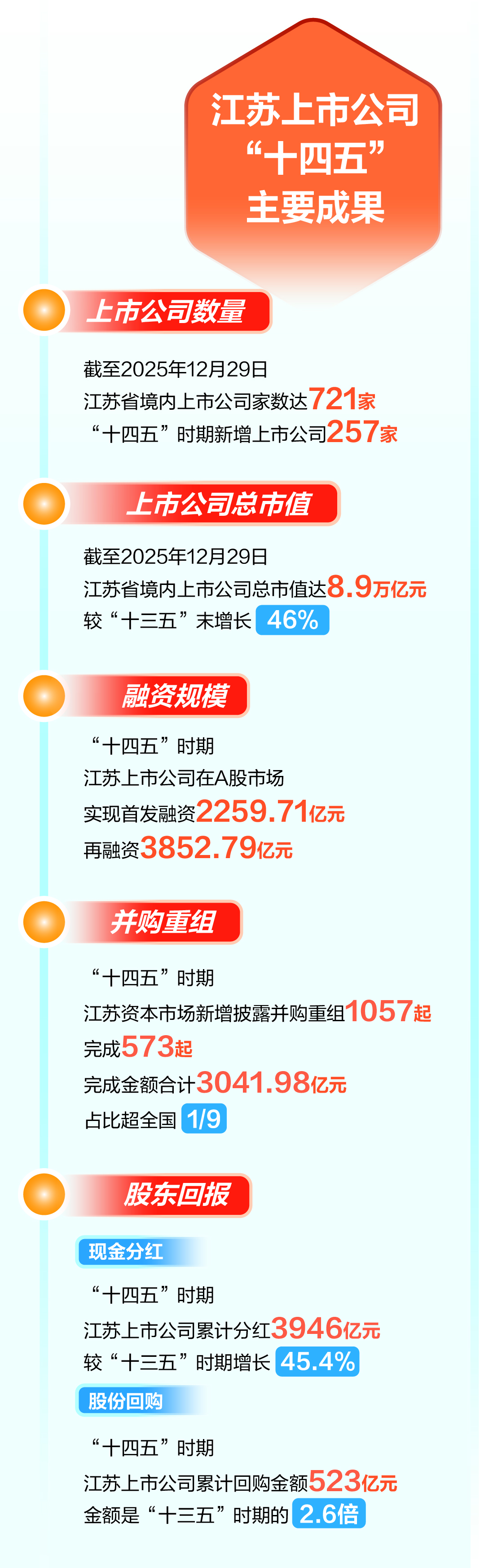 证券时报记者 臧晓松 “十四五”时期,有着“苏大强”之称的江苏,交出了分量十足的资本市场成绩单:全省新增上市公司257家,其中约九成为科技企业或科技含量较高的企业;全省上市公司总数达到721家,累计完成首发融资2259.71亿元、再融资3852.79亿元,为企业技术迭代、产能扩张提供了充足资金“弹药”。 江苏上市公司群体既担负着引领传统行业转型破局的任务,又承载着科技创新和产业创新深度融合的希望。展望“十五五”,当地将继续鼓励上市公司不断做优做强,为“经济大省挑大梁”提供坚实支撑。 “江苏军团”规模效益双优 “十四五”时期,江苏上市公司群体实现了从“量的积累”到“质的飞跃”,成为稳定区域经济大盘的重要力量。 截至2025年12月29日,全省境内上市公司家数达721家,数量占全国的1/8,形成了全国规模领先的上市公司集群;总市值攀升至8.9万亿元,较“十三五”末增长46%,千亿市值龙头企业从7家增至11家,行业引领作用持续凸显。直接融资渠道持续畅通,“十四五”时期累计完成首发融资2259.71亿元、再融资3852.79亿元,为企业技术迭代、产能扩张提供了充足资金“弹药”,有力支持了江苏经济发展。 2025年上半年,全省上市公司合计实现营业收入1.7万亿元,同比增长1.2%,占全省GDP比重超1/4;合计实现净利润1527亿元,同比增长3.7%,两项核心指标增速均高于全国平均水平。六成公司营收实现同比增长,四成公司营收突破10亿元,45家企业营收增幅超50%;八成公司保持盈利状态,五成公司净利润同比正增长,137家企业净利润增幅超50%,优质企业梯队的盈利能力与成长潜力充分释放。 “硬科技”成色持续提升 江苏聚焦产业优势,围绕“1650”现代产业体系、“51010”战略性新兴产业集群体系等,支持上市公司结构优化,“硬科技”成色持续提升。 “十四五”时期,要素资源向高端装备制造、人工智能、生物医药等重点产业链集聚,全省新增上市公司257家,其中约九成为科技企业或科技含量较高的企业,创新型企业已成为资本市场“江苏军团”的核心支柱。 截至目前,江苏上市公司已全面覆盖16个先进制造业产业集群和50条重点产业链,有力服务全省新型工业化建设。科创板、北交所上市公司分别达115家、56家,数量稳居全国首位;国家级专精特新“小巨人”企业373家、战略新兴产业上市公司305家,均占全国同类公司的约1/6。其中,代表半导体行业的通富微电、代表生物医药行业的迪哲医药,借助资本市场,在业务规模上都实现了跨越式发展。 并购重组驶入“快车道” 近五年来,江苏资本市场新增披露并购重组1057起,完成573起,完成金额合计3041.98亿元,占比超全国1/9。特别是“并购六条”发布以来,制度包容性、适应性进一步提升,江苏从“有能主体、有效市场、有为政府、有力监管”四个维度打造并购重组生态体系,助力全省“筑峰强链”行动,资本市场并购重组量质齐升。 “并购六条”实施以来,并购重组亮点纷呈。一是总量领先:新增披露并购重组323起,实施完成207起,完成并购重组总金额超过974.86亿元,在全市场占比11.6%。二是民营企业活跃:民营企业发起并购重组263起,占比超80%,其中华海诚科通过发股购买资产的方式,提升综合竞争力,是民营企业积极利用并购重组工具“做大做强”的典型案例。三是有效支撑新型工业化:江苏制造业上市公司发起并购重组216起,占比近七成,集中在机械设备、半导体、医药生物等板块,“硬科技”特色显著,是资本市场推进新型工业化强大动力的生动缩影。 投资者回报意识显著增强 “十四五”时期,江苏上市公司主动回报投资者的意识显著增强,通过现金分红、股份回购、增持等多元举措,构建起稳定可持续的投资者回报体系。 现金分红方面,“十四五”时期,江苏上市公司累计分红3946亿元,较“十三五”时期增长45.4%,股利支付率37.8%,提高4.6个百分点,103家上市公司累计分红金额超过其股权融资金额;2025年,有162家公司计划开展中期分红,同比增长11.72%。 股份回购方面,“十四五”时期,江苏上市公司累计回购金额523亿元,金额是“十三五”时期的2.6倍。回购增持贷款方面,截至目前,70家上市公司获批专项贷款开展回购增持,回购增持再贷款获批额度近140亿元。江苏上市公司通过积极主动的分红、回购、增持,有力提振了市场信心,维护了公司价值,在资本市场波动中发挥了关键的“稳定器”作用。 助力“强富美高”新江苏现代化建设 证券时报记者了解到,“十四五”时期,江苏证监局持续强化监管精准性和有效性,推动形成规范有序的市场生态。推动上市公司关键少数提高规范运作的自觉性,近两年先后召开六场上市公司高质量发展暨监管工作会议,通过与市场关键少数的面对面交流,引导上市公司进一步提升规范意识,辖区600余名上市公司董事长、实际控制人参加并现场签署应知应会知情承诺书;系统梳理辖区上市公司违法违规问题,形成《上市公司常见违规事项提示清单》《上市公司违法典型案例》,要求辖区上市公司、中介机构开展学习并推动自查自纠。 “十四五”时期,江苏证监局全面释放行政处罚威慑力,加大立体追责力度,对27家上市公司作出行政处罚,数量是“十三五”时期的4倍多。持续加大投资者保护力度,发挥全国首家证券融合法庭的作用,成立一年来为649名投资者挽损4500余万元,入选证监会2025年度投资者