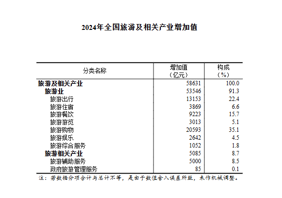 2024年全国旅游及相关产业增加值占GDP比重为4.35% 经核算,2024年全国旅游及相关产业增加值为58631亿元,占国内生产总值(GDP)的比重为4.35%,比上年提高0.11个百分点。 从内部构成看,旅游业增加值为53546亿元,占旅游及相关产业增加值比重为91.3%,比上年提高0.3个百分点。旅游相关产业增加值为5085亿元,占旅游及相关产业增加值比重为8.7%,比上年下降0.3个百分点。