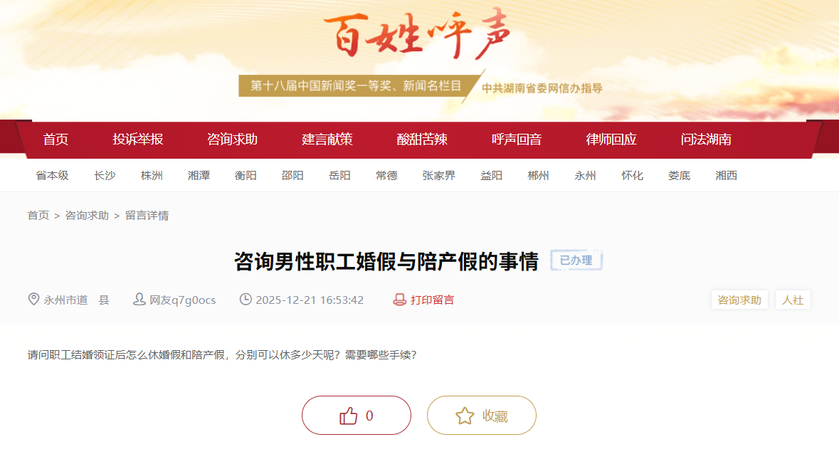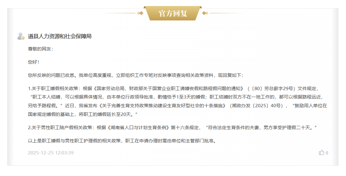 红网时刻新闻12月30日讯(记者 陈星晓)近日,有网友在红网《百姓呼声》栏目咨询男性职工婚假与陪产假相关政策,道县人力资源和社会保障局就此作出详细答复,明确了相关休假天数和申请条件。 该网友询问,男性职工结婚后如何休婚假和陪产假、分别可休多少天以及需要办理哪些手续。对此,道县人社局回应称: 关于婚假,根据《国家劳动总局、财政部关于国营企业职工请婚丧假和路程假问题的通知》文件规定,职工本人结婚,可以根据具体情况,由本单位行政领导批准,酌情给予1至3天的婚假;职工结婚时双方不在一地工作的,都可以根据路程远近,另给予路程假。同时,湖南省近期出台的《关于完善生育支持政策推动建设生育友好型社会的十条措施》中提出,“鼓励用人单位在国家规定婚假的基础上,将职工的婚假延长至20天。” 关于男性陪产假(护理假),依据《湖南省人口与计划生育条例》第十六条,符合法定生育条件的夫妻,男方享受护理假20天。 道县人社局提醒,职工在申请婚假或陪产假时,均需经所在单位及主管部门批准。