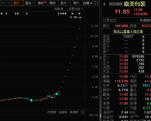 AI 智能体产业迎来新节点。 嘉美包装连续10个涨停板 今日(12月30日)早盘,A股大盘指数窄幅震荡,短剧游戏、云游戏、数字货币、液冷服务器、智谱AI等题材走强。海南自贸、BC电池、次新股、HJT电池、水产品等题材跌幅靠前。 嘉美包装(002969)早盘再次涨停,盘中涨停板封单超过80万手。该股自12月17日以来连续录得10个涨停板,最新股价创近5年新高,A股市值达到110亿元以上。公司近期股价持续大涨,与一则股权转让公告密切相关。
